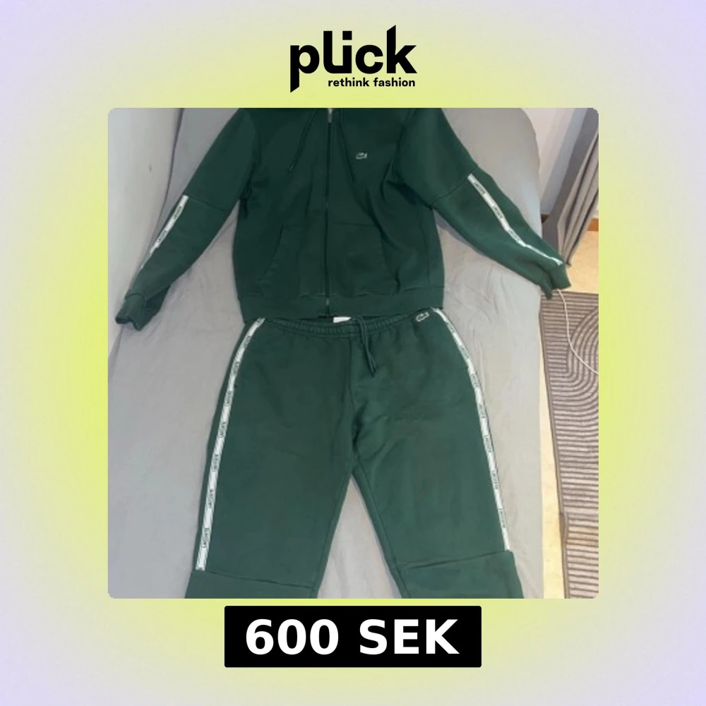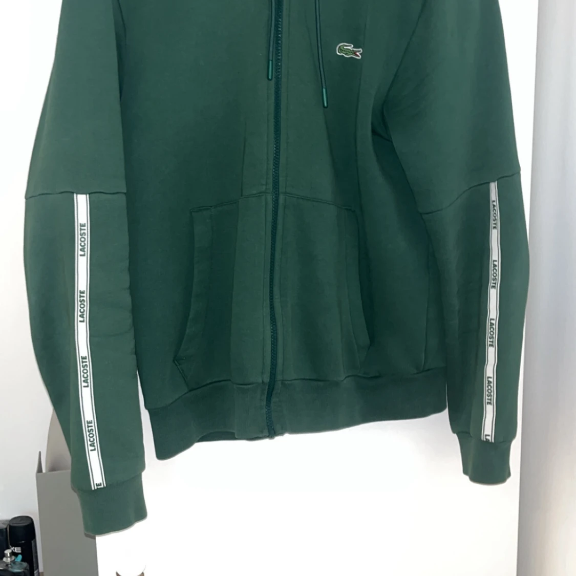 Mörkgrön dress från Lacoste med vit logotypband längs ärmarna och klassisk krokodil på bröstet. Tröjan har huva med snörning, dragkedja framtill och två fickor. Perfekt för en sportig och chill stil. Tvättas innnan ja skickar den