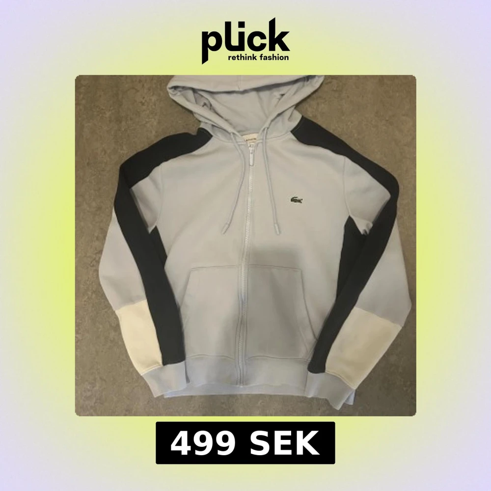 Snygg ljusgrå hoodie från Lacoste med klassisk krokodillogga på bröstet. Tröjan har svarta och vita paneler på ärmarna, huva med snörning och hel dragkedja framtill. Perfekt för chill eller streetwear. Materialet känns mjukt och är troligen bomull eller polyester.