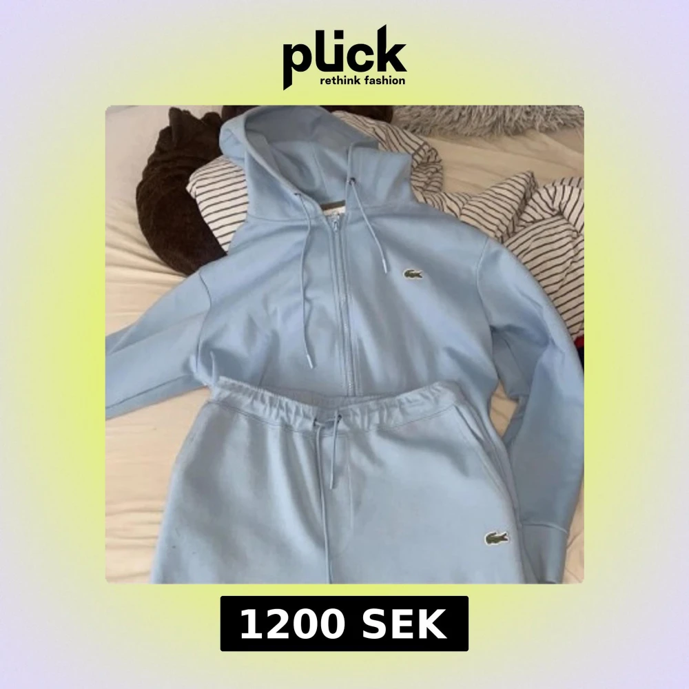 Säljer en ljusblå tracksuit från Lacoste med dragkedja och huva. Tröjan har snörning vid huvan, långa ärmar och den klassiska krokodilloggan på bröstet. Perfekt för en chill och sportig look.