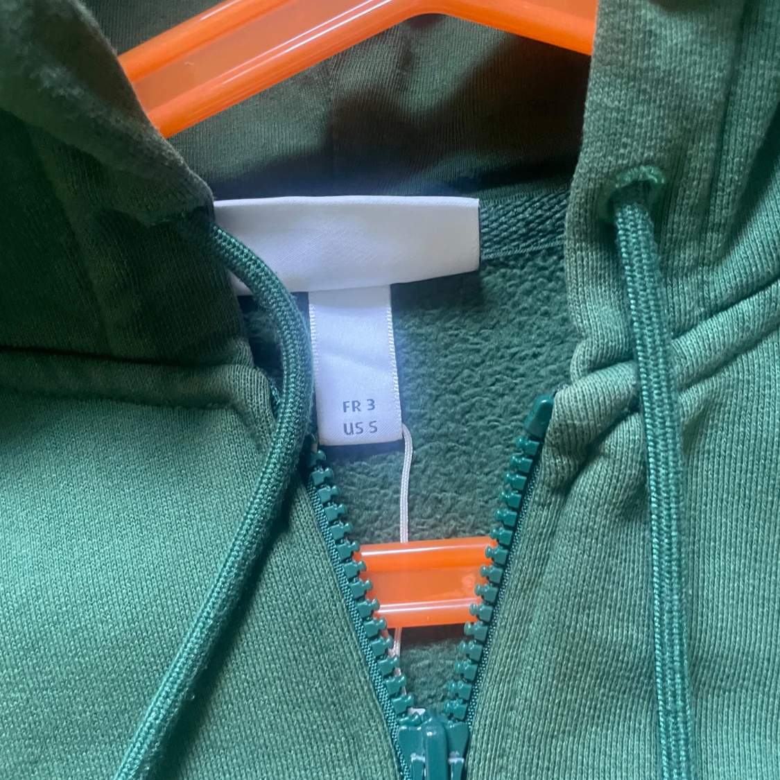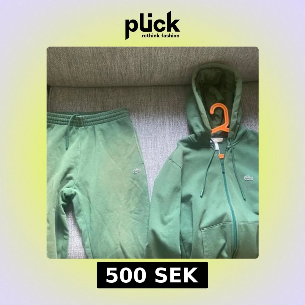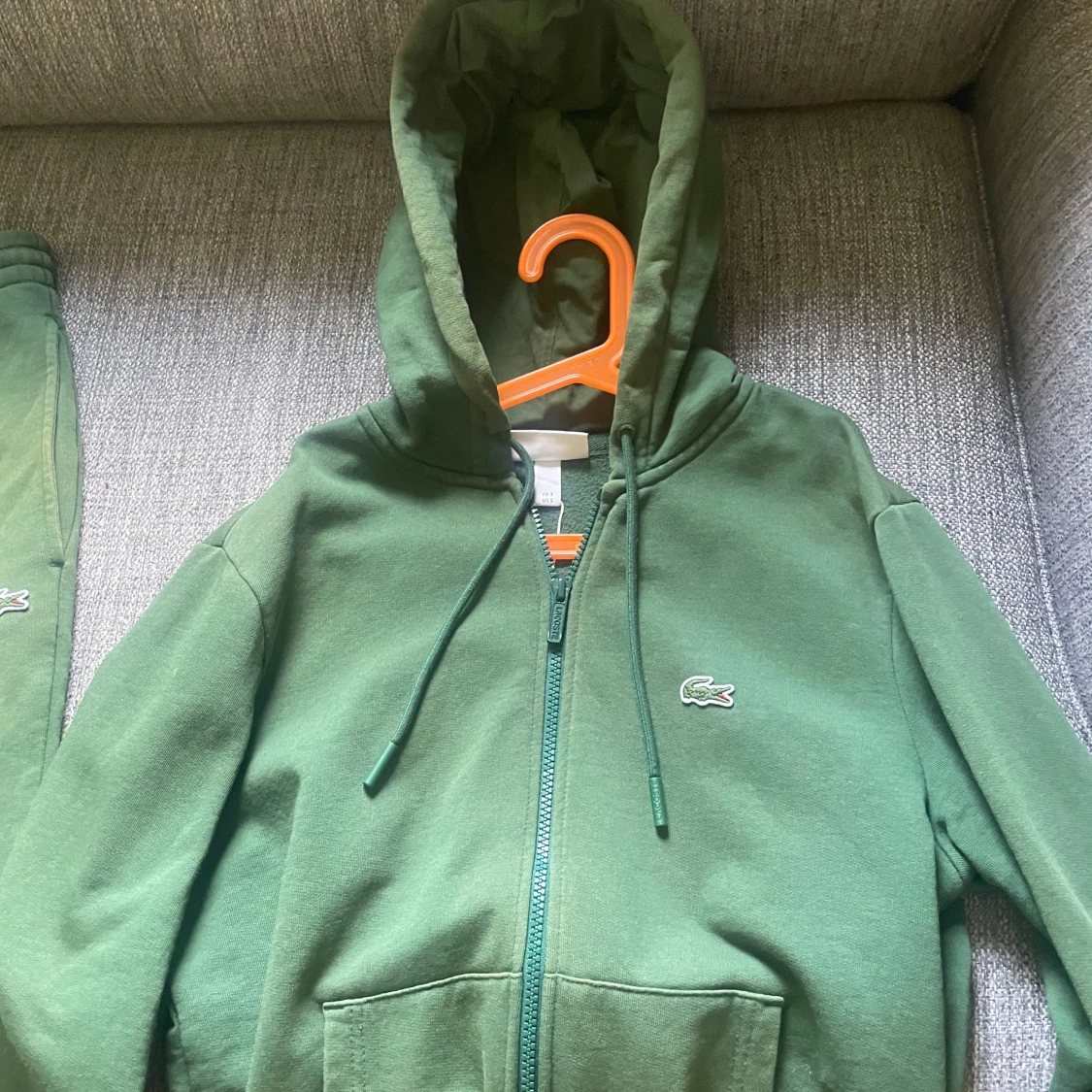 Säljer en grön dress från Lacoste med dragkedja och huva. Tröjan har en broderad logotyp på bröstet och snörning vid huvan. Perfekt för en avslappnad stil.