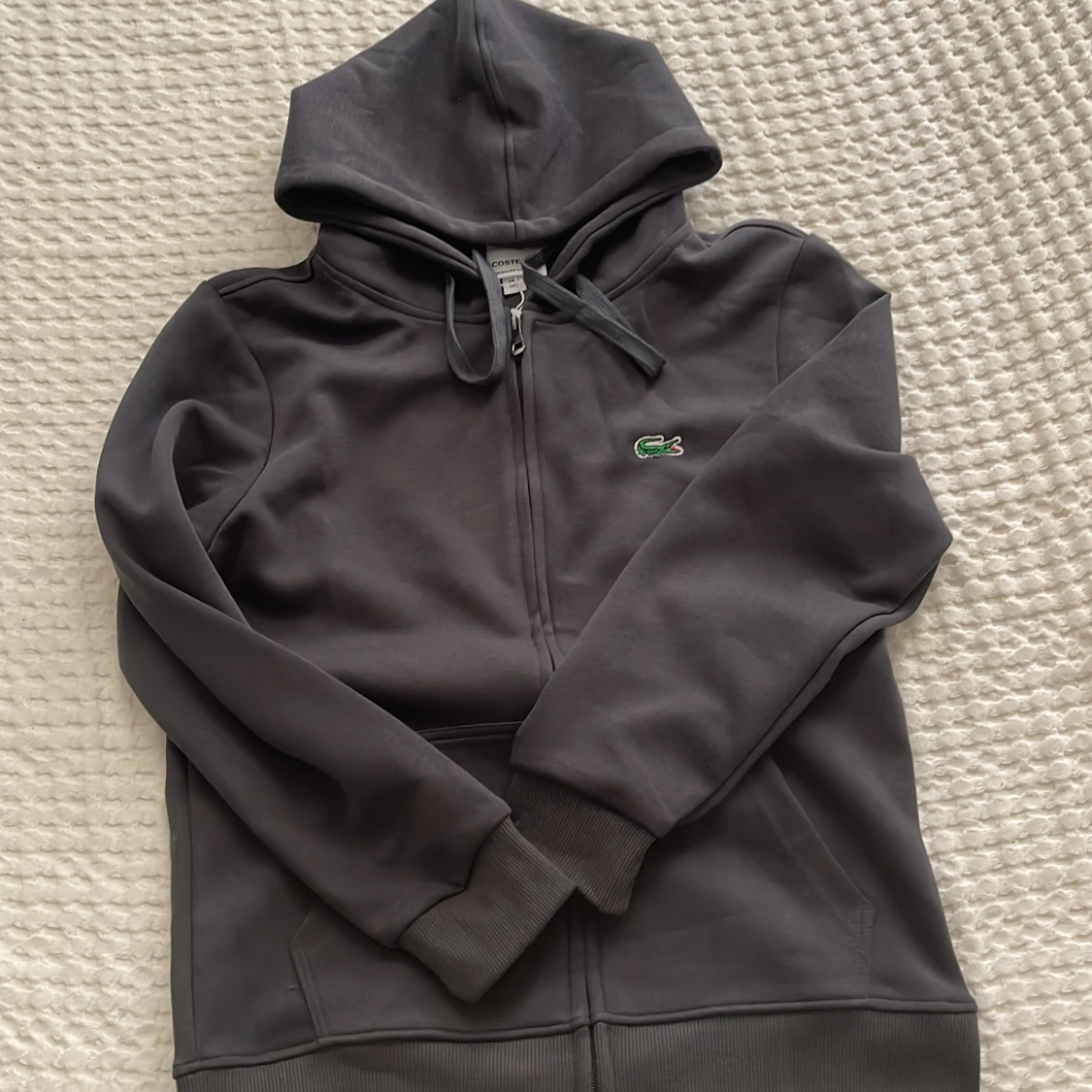 Snygg grå hoodie från Lacoste med klassisk krokodillogga på bröstet. Tröjan har huva med snörning, långa ärmar och praktisk dragkedja framtill. Perfekt för chill dagar och enkel att matcha med jeans eller joggers.