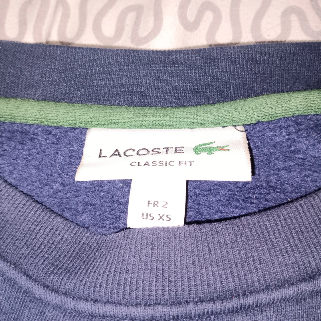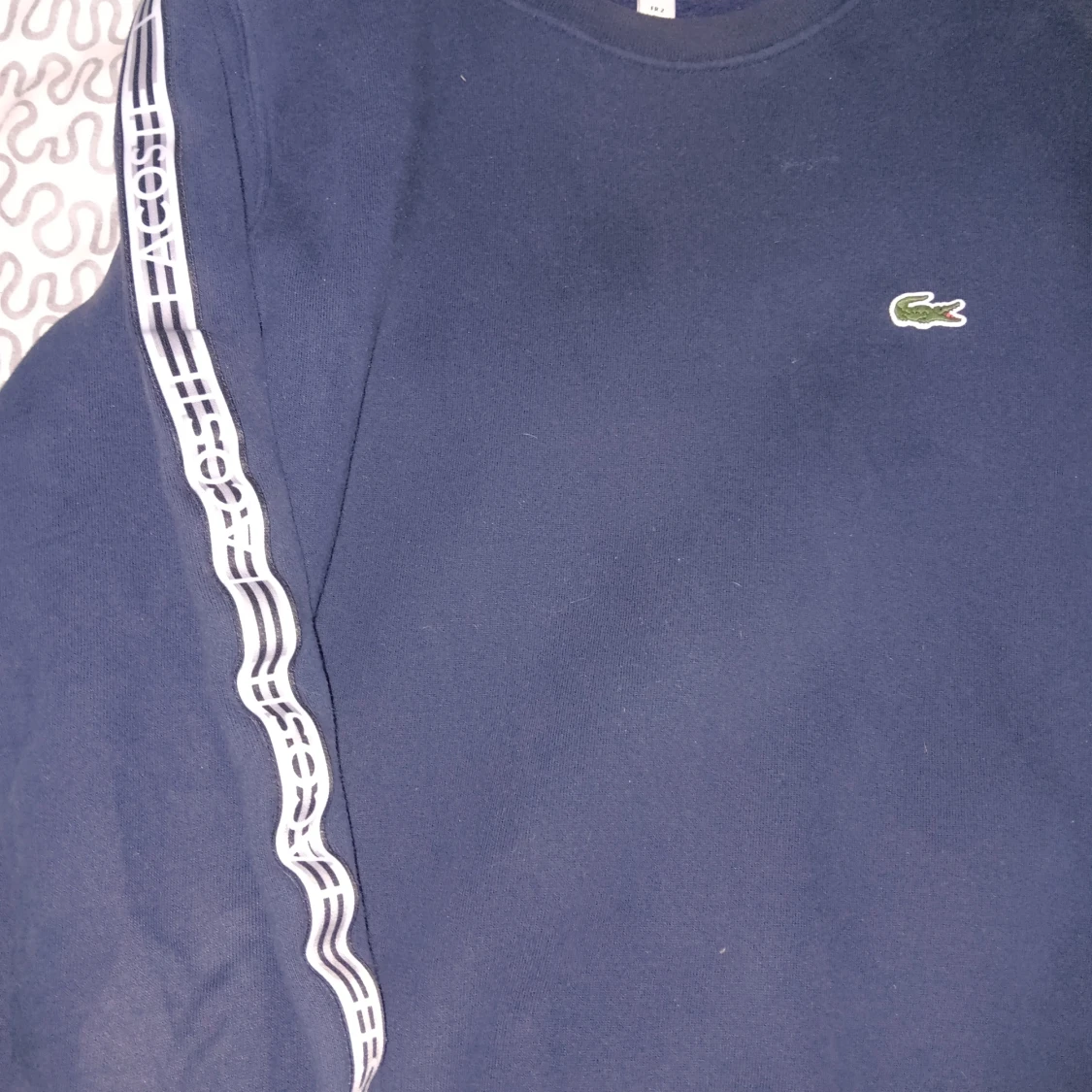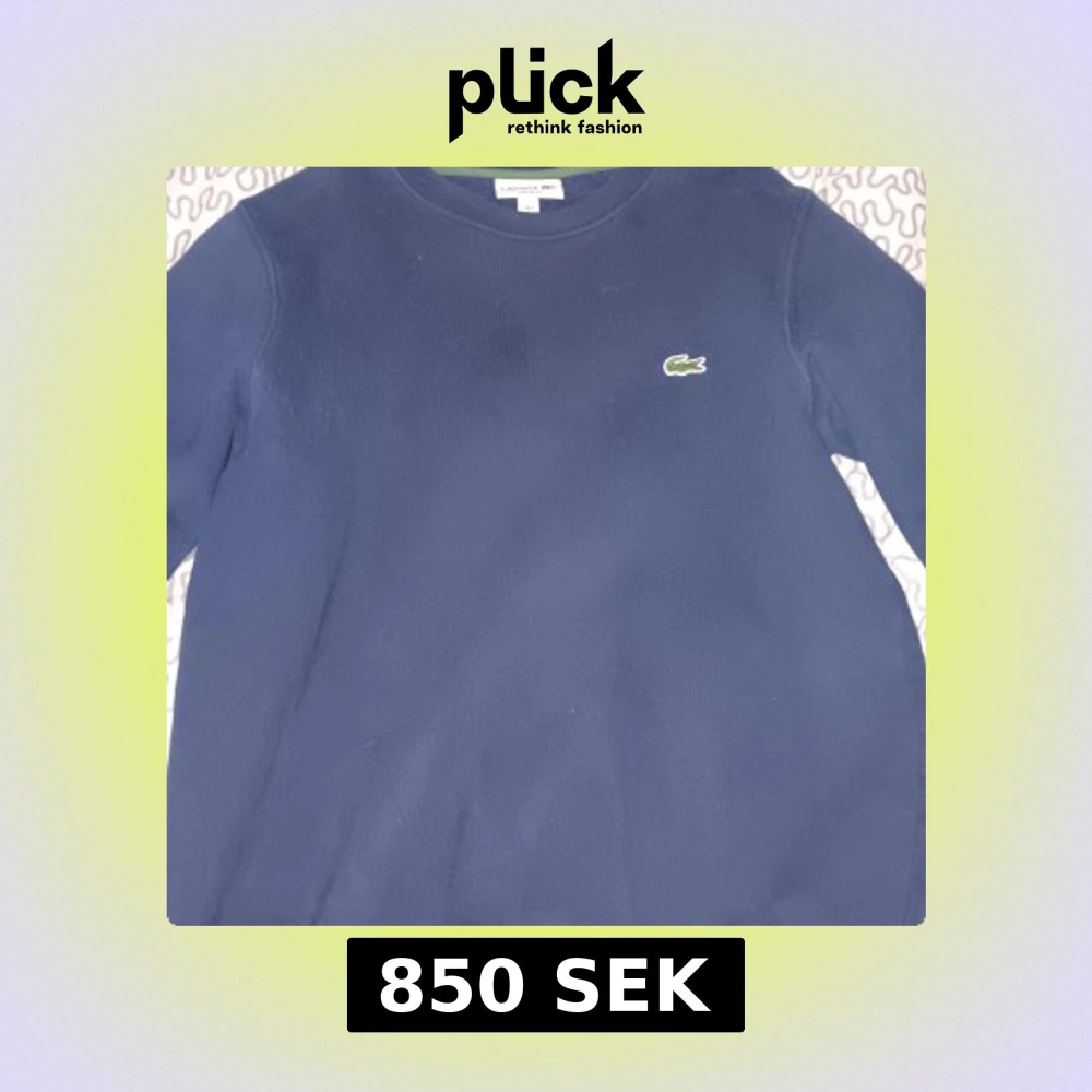 Mörkblå crewneck från lacoste köpt för nypris på 1500kr. klassisk modell med rund hals och lång ärm. Ikoniska krokodilloggan broderad på bröstet och vit detalj längs ärmarna. Skön bomullskänsla och relaxed fit, perfekt för en chill och stilren look.