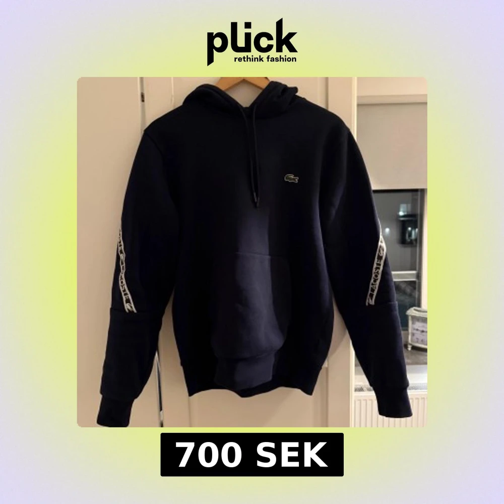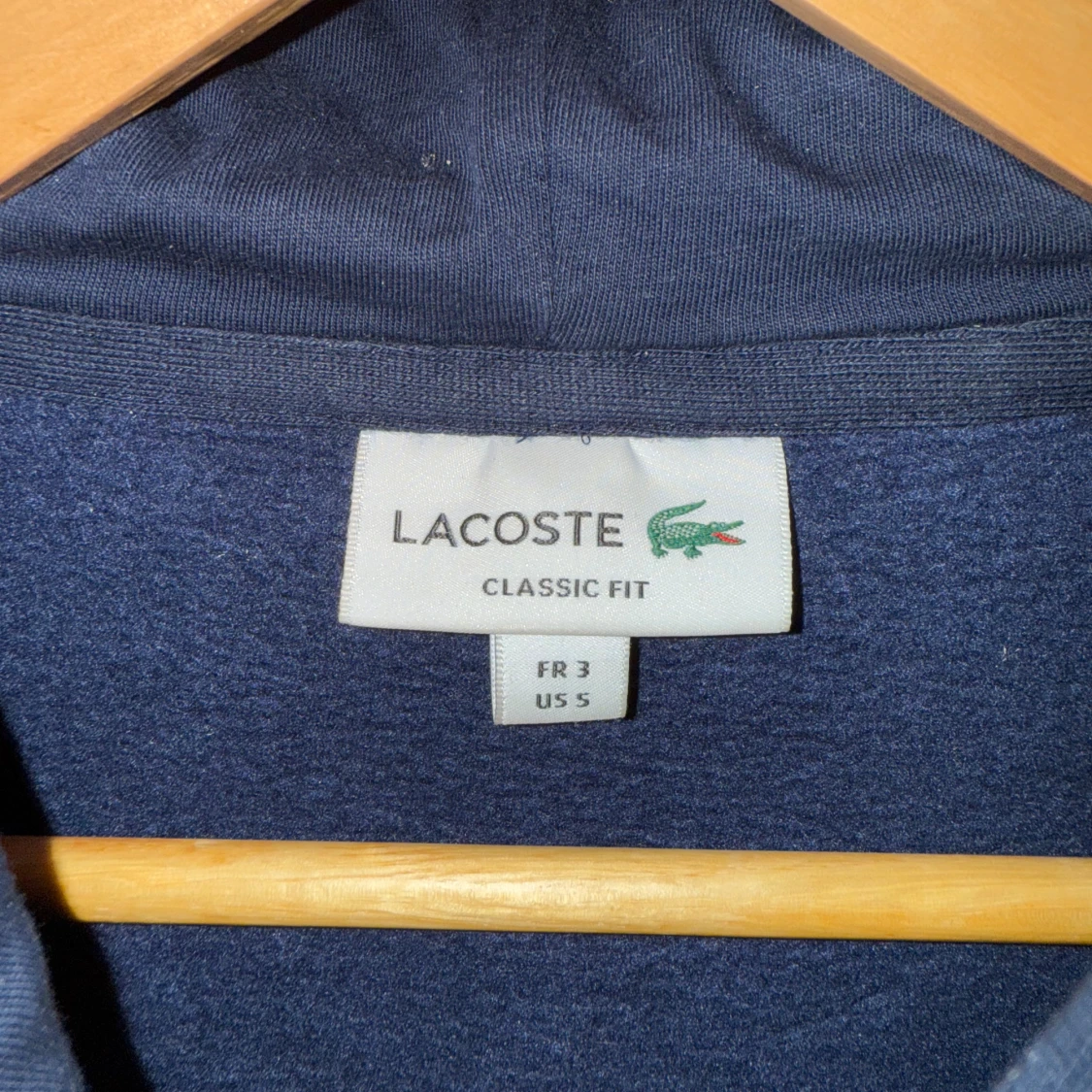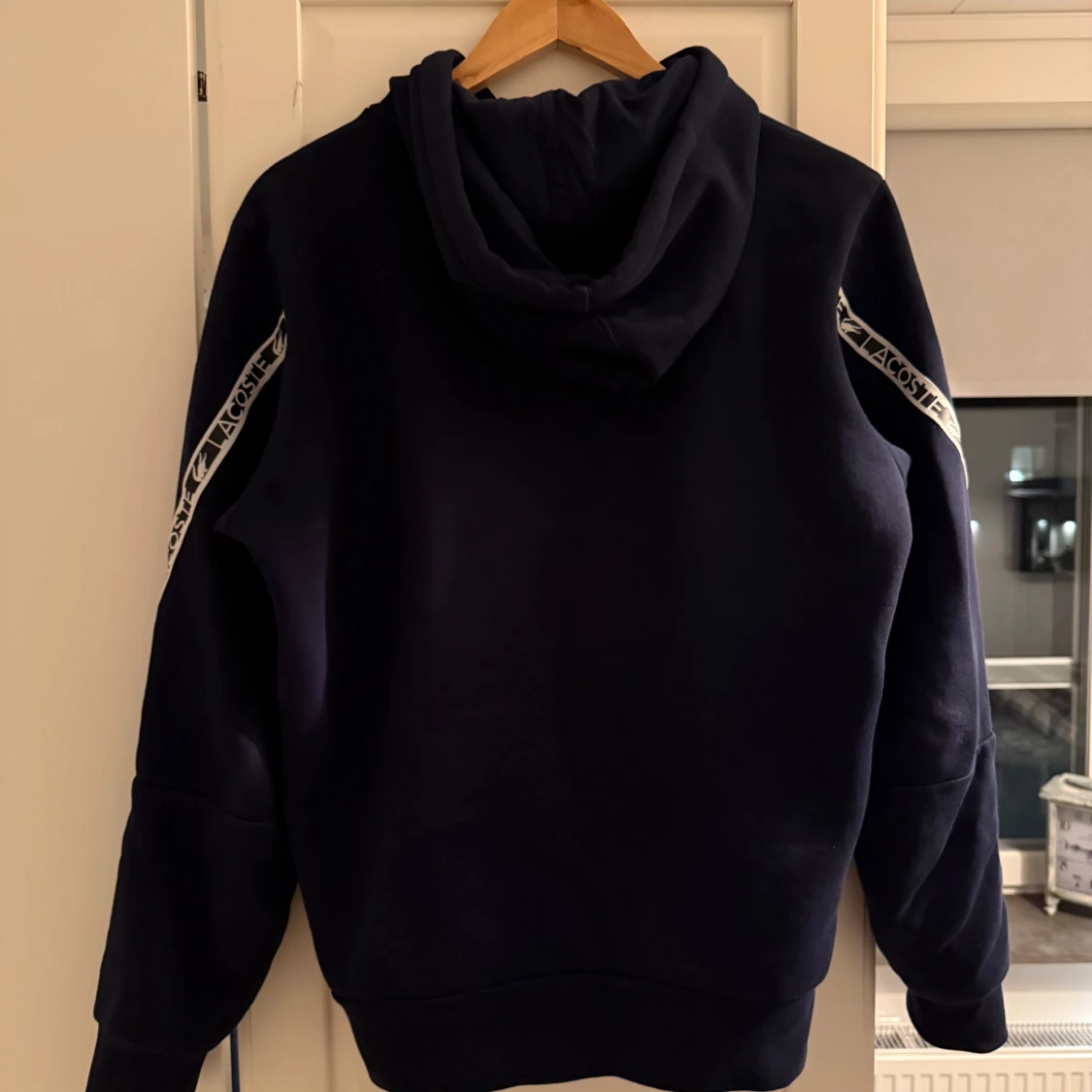 Säljer en mörkblå hoodie från Lacoste med klassisk passform. Tröjan har huva med snörning, stor magficka och vita Lacoste-loggor längs ärmarna. Perfekt för dig som gillar stilren streetwear med sportig vibe.