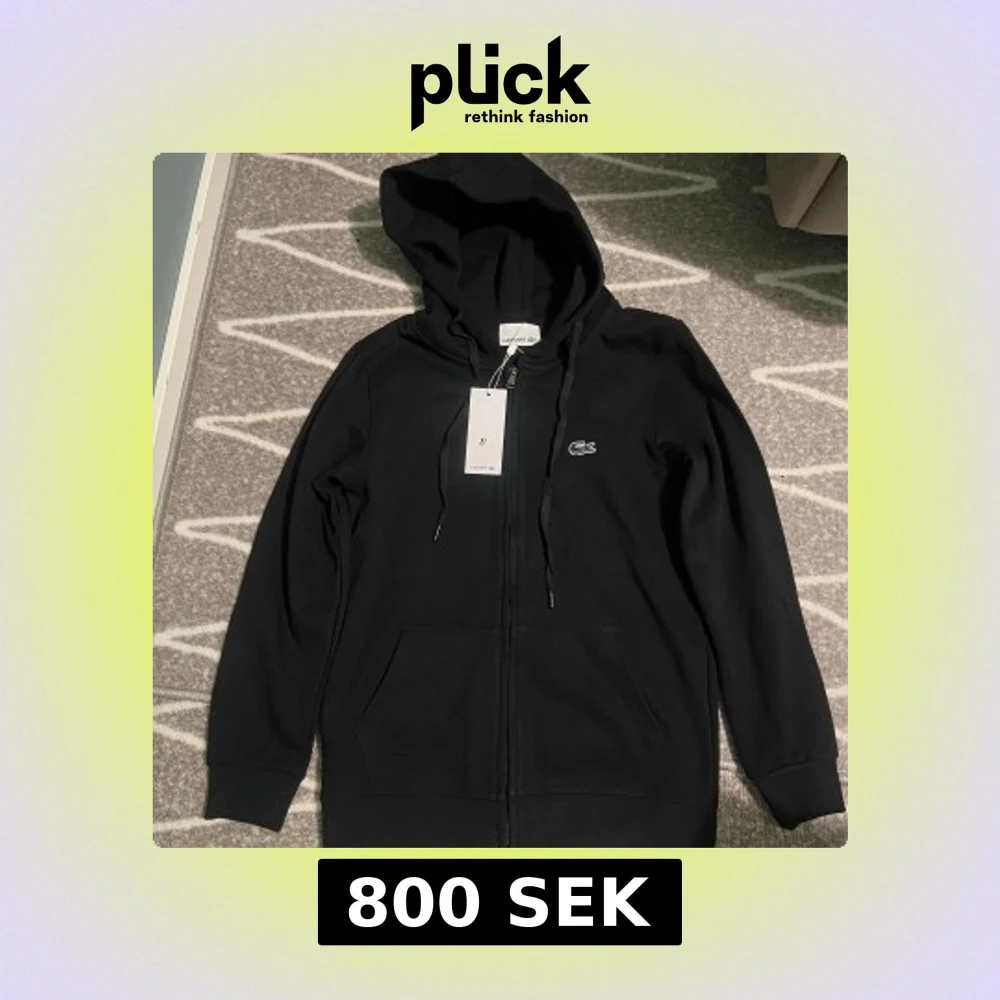 Säljer en stilren svart hoodie från Lacoste med dragkedja och den klassiska krokodilloggan på bröstet. Perfekt för en avslappnad look. Hoodien har långa ärmar och en praktisk huva med dragsko.