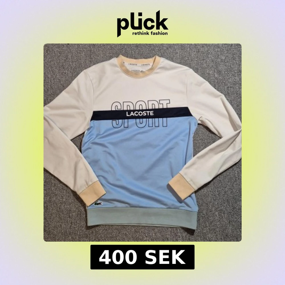 Snygg sweatshirt från Lacoste Sport i beige och ljusblått med mörkblå detalj och stor SPORT-tryck på bröstet. Klassisk rund hals, ribbade muddar och ikoniska krokodilloggan nertill. Perfekt för en sportig och chill stil.