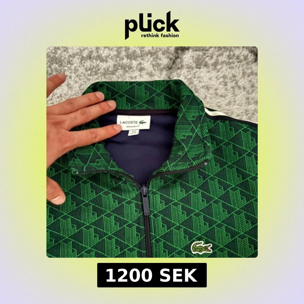 Säljer en grön långärmad ziptröja från Lacoste med svart och grönt geometriskt mönster, vita ränder på axlarna och klassisk krokodillogga på bröstet. Tröjan har dragkedja hela vägen och ribbade muddar. Perfekt för dig som gillar sportig och stilren look.