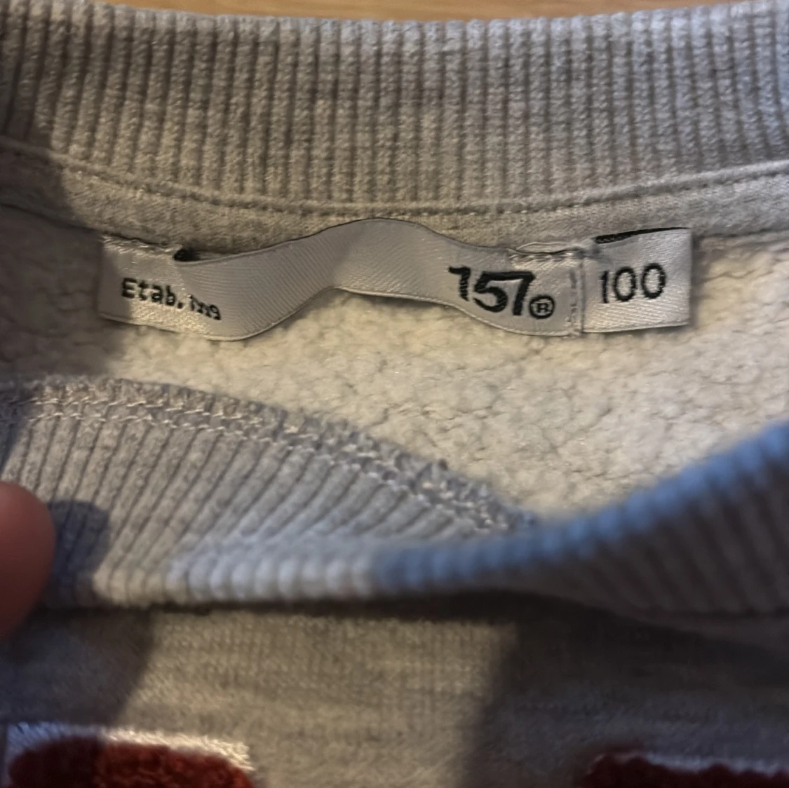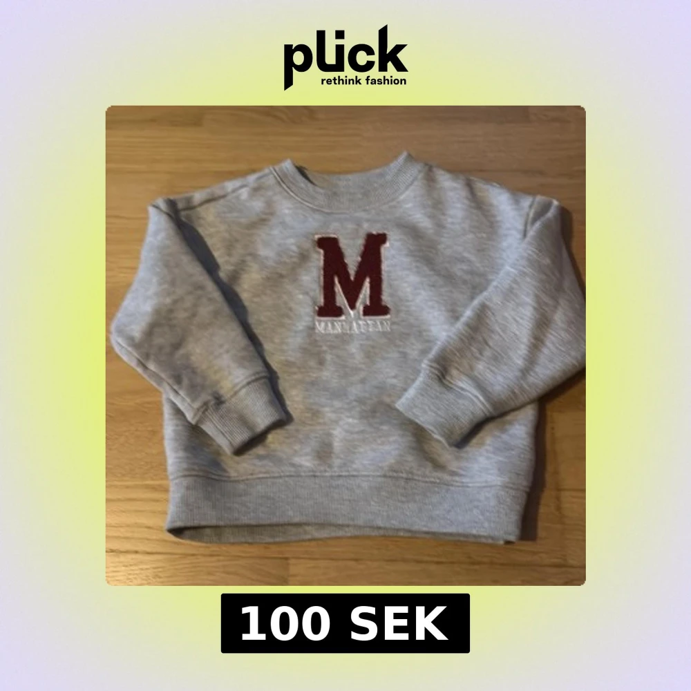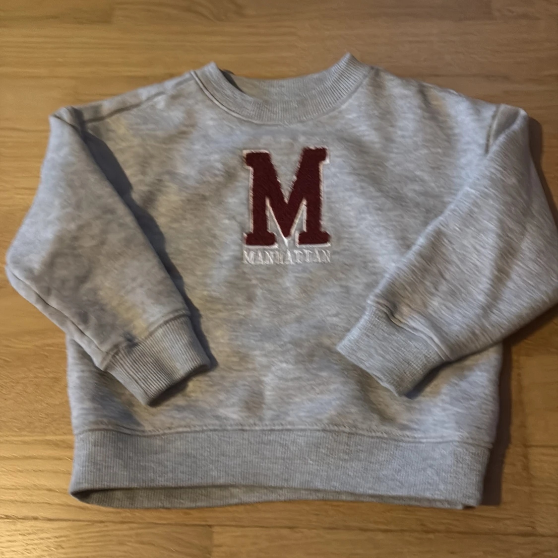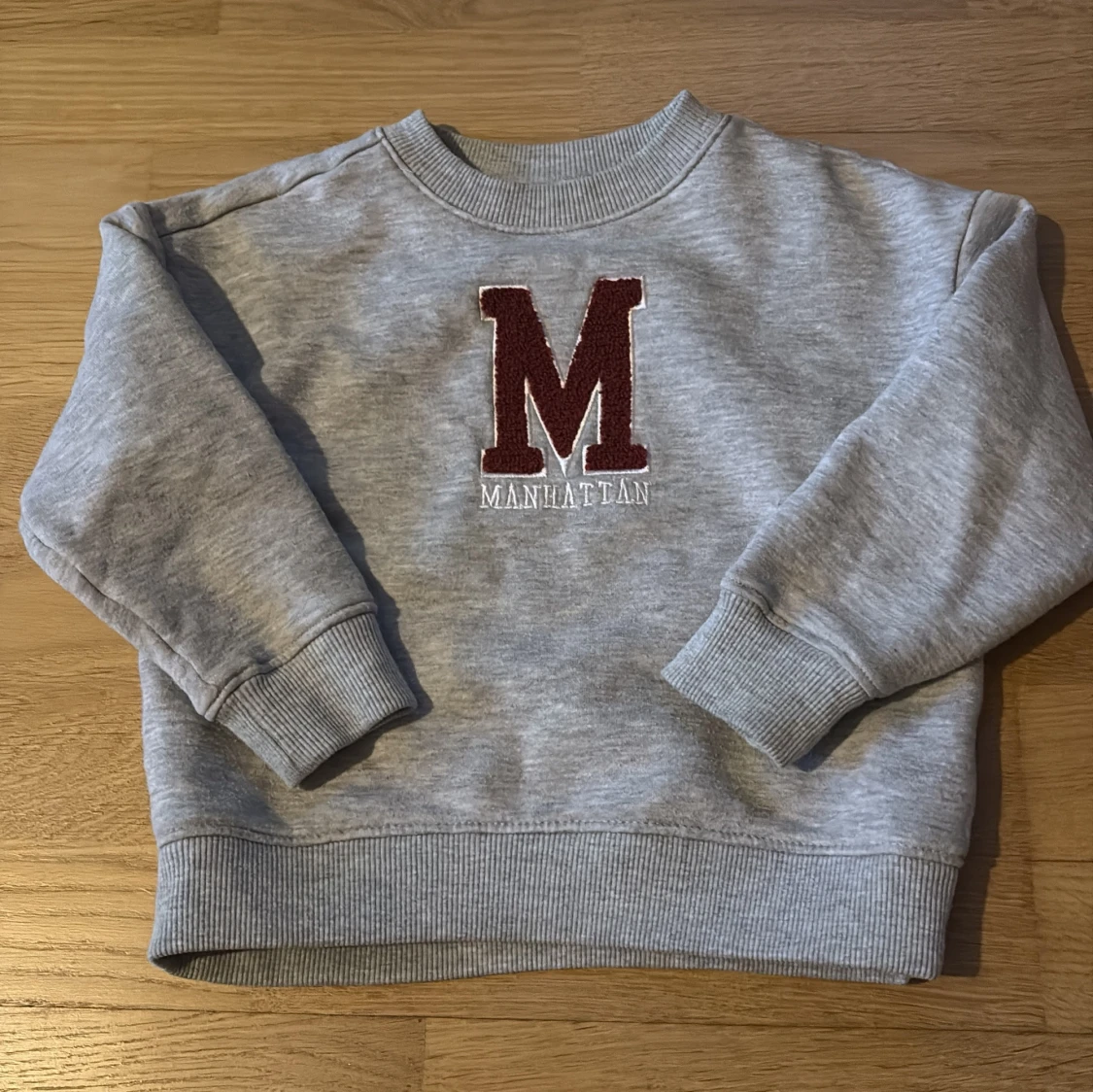 Grå sweatshirt från 157 med stor röd M och texten Manhattan broderat på bröstet. Tröjan har rund hals, ribbade muddar och är långärmad. Perfekt för dig som gillar college-stil och vill ha något bekvämt och snyggt.