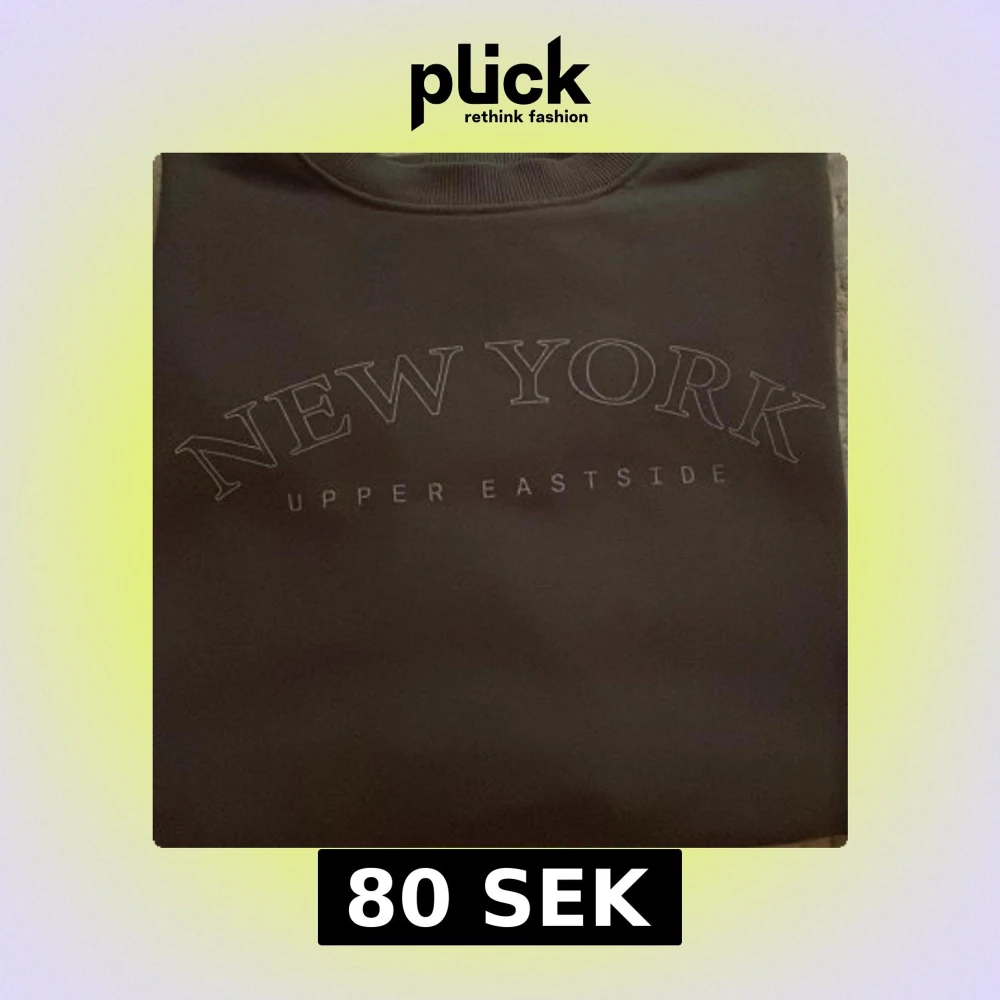 Säljer en mörkgrå sweatshirt med texten 'NEW YORK UPPER EASTSIDE' tryckt på bröstet. Tröjan har rund halsringning och långa ärmar. Perfekt för en avslappnad och trendig stil.