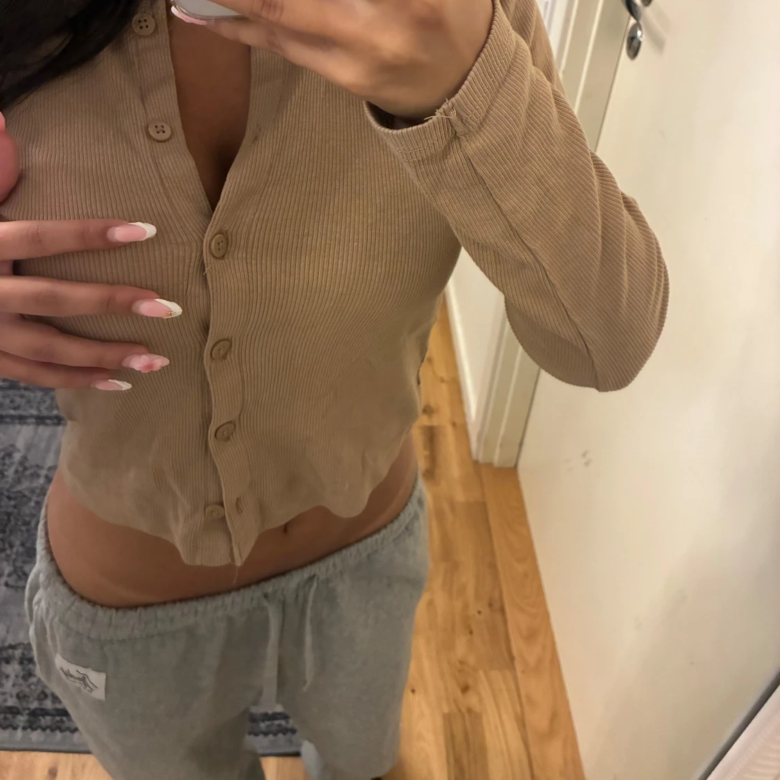 Säljer en croppad beige kofta med ribbad struktur och långa ärmar. Koftan har en snygg knappstängning framtill och är tillverkad i mjukt material som sitter skönt mot kroppen. Perfekt för dig som gillar en chill och trendig look.