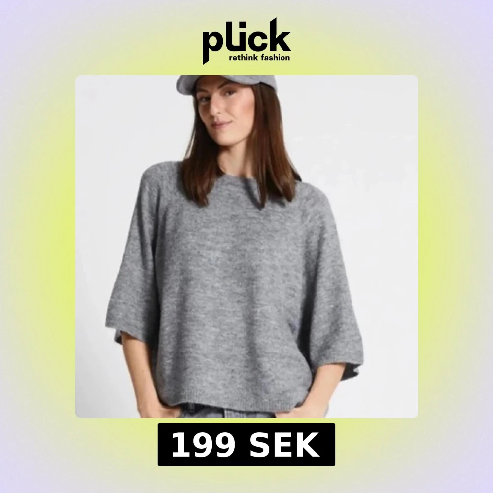 Säljer en grå stickad tröja med rund hals och vida, trekvartsärmar. Tröjan har en avslappnad passform och är perfekt för lager-på-lager. Enkel och stilren design som passar till mycket.