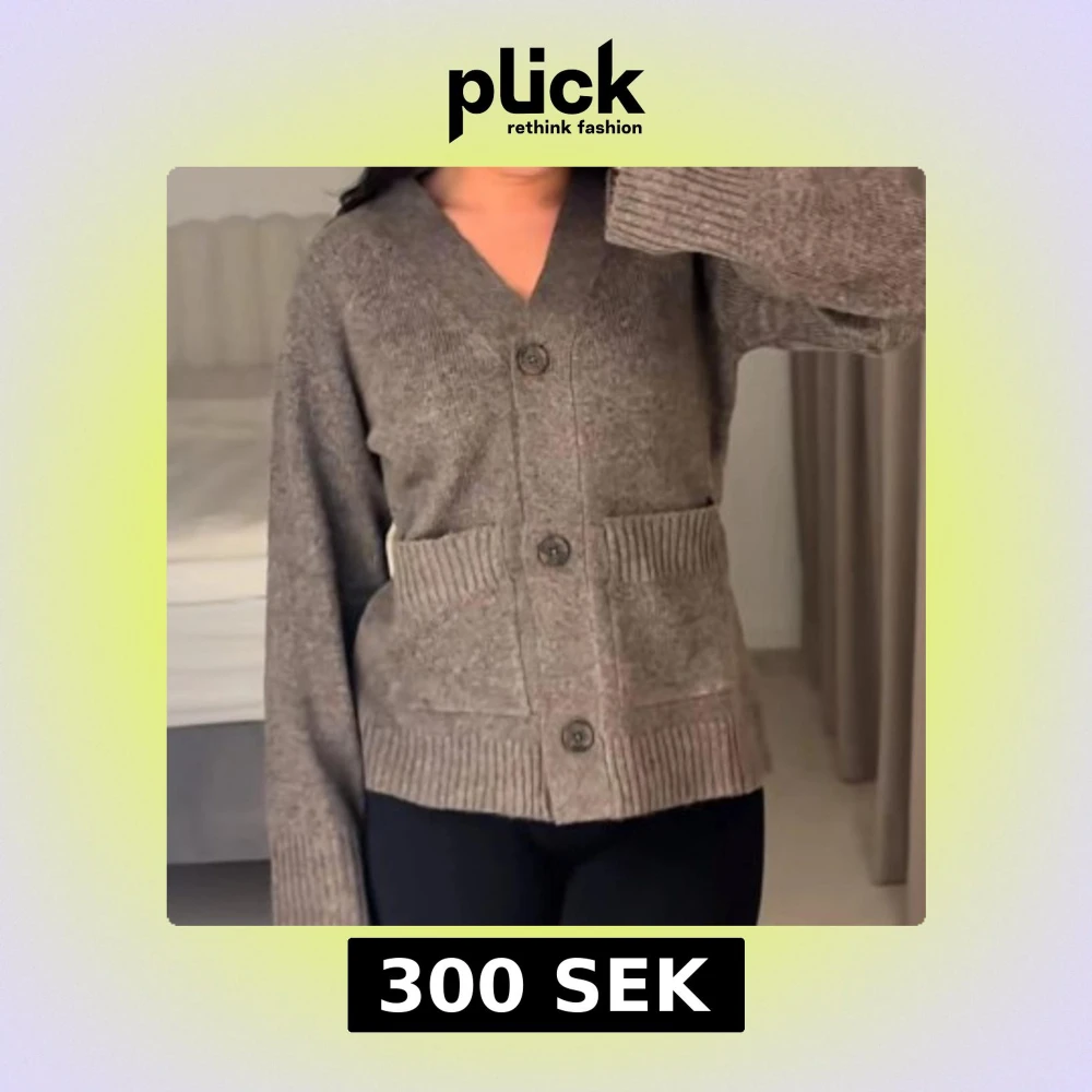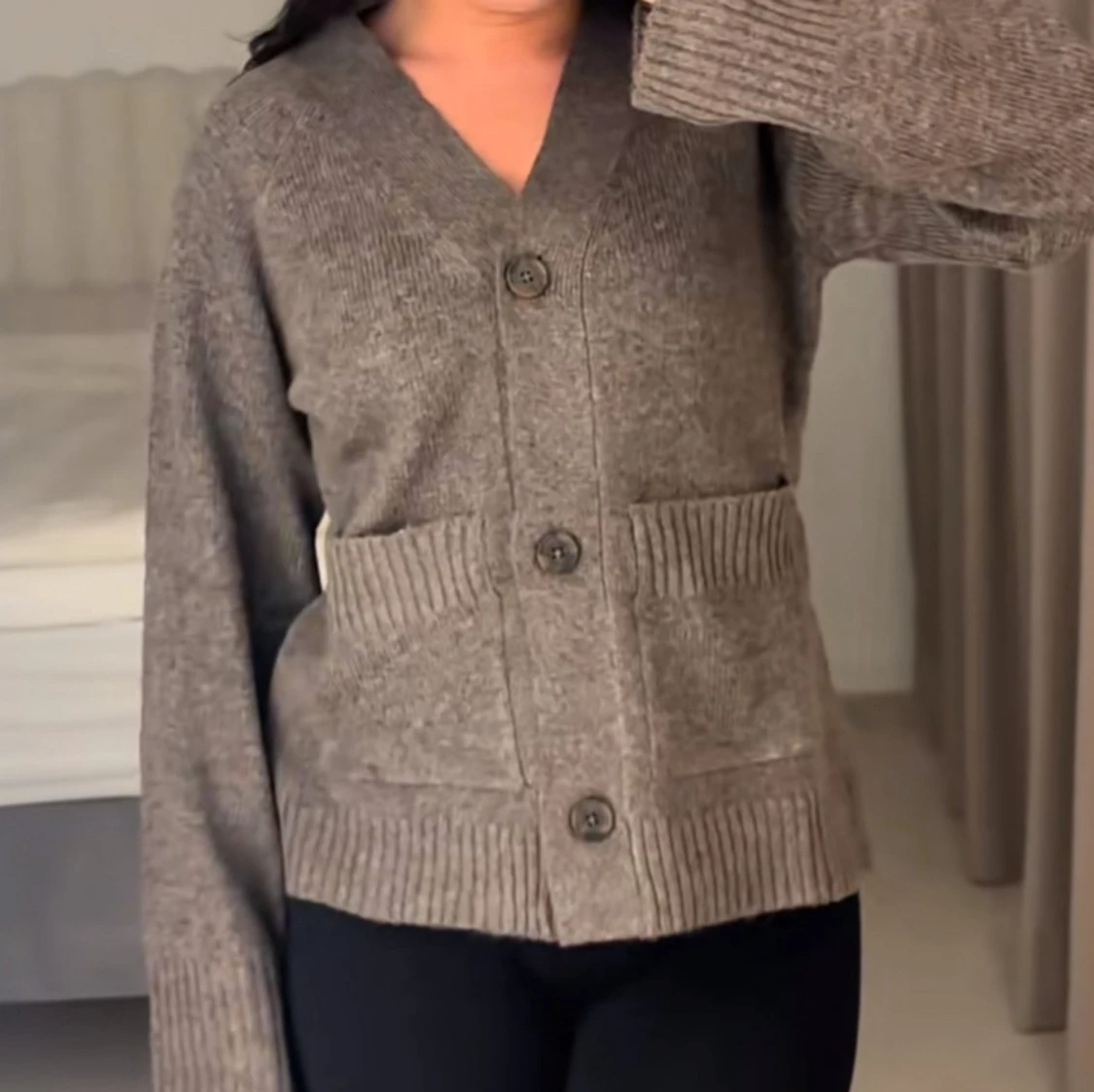 Mysig brun stickad kofta med v-ringning och stora knappar framtill. Koftan har ribbade muddar och fickor på sidorna, perfekt för lager-på-lager och chill dagar. Långärmad och loose fit för en avslappnad vibe. Endast testad, lappar kvar, slutsåld på hemsidan