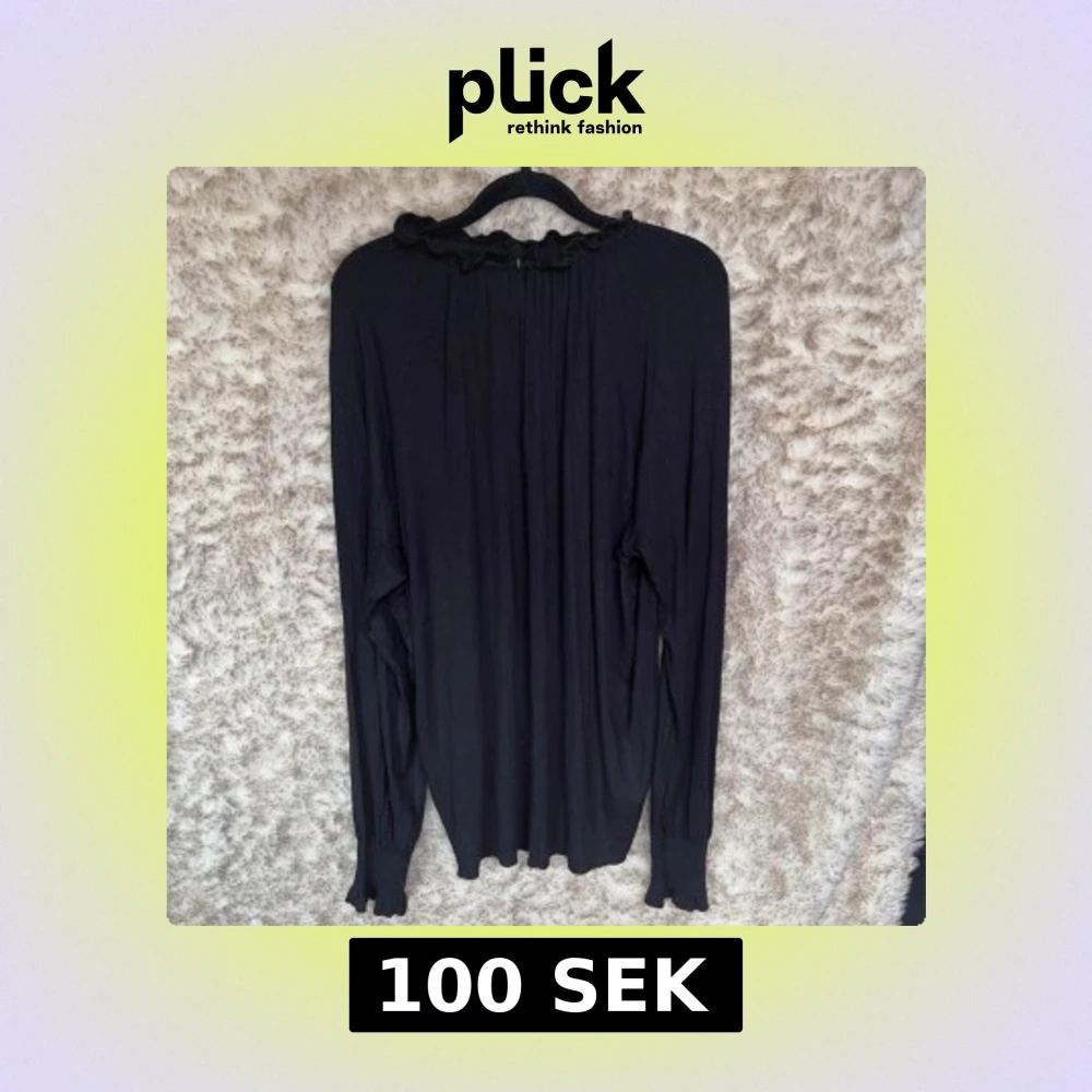 Svart stretchiga tröja med lite högre vågig hals. Rynkade ärmmuddar med resår. Knapp på baksidan. Finns ingen lapp med storlek men då den är väldigt stretchig, kanske en L.