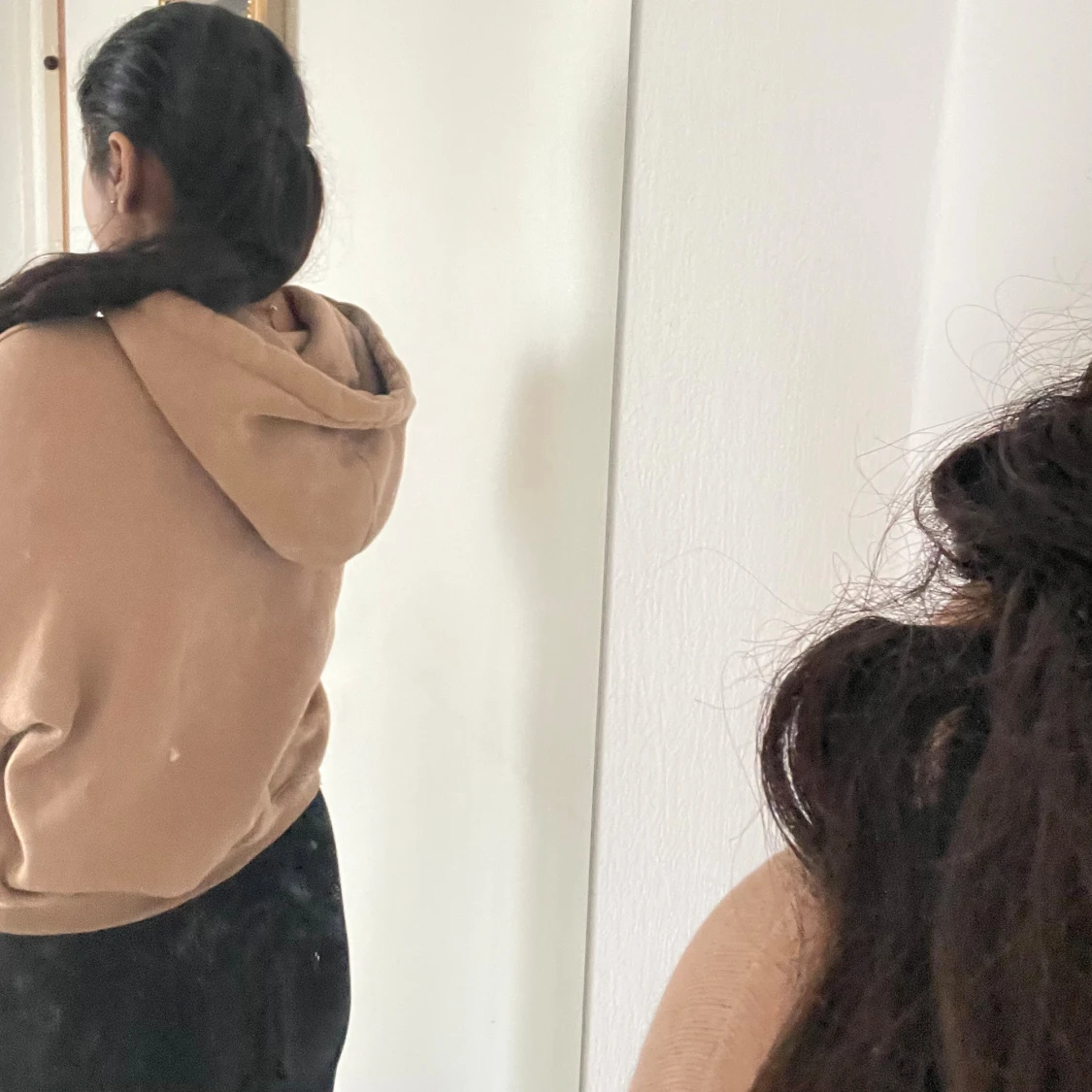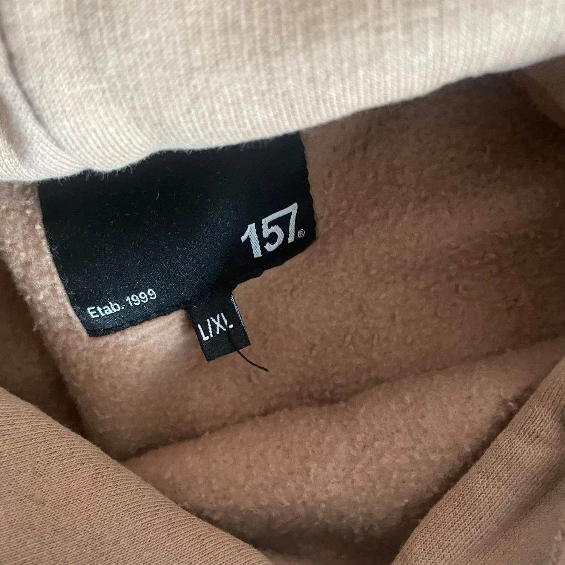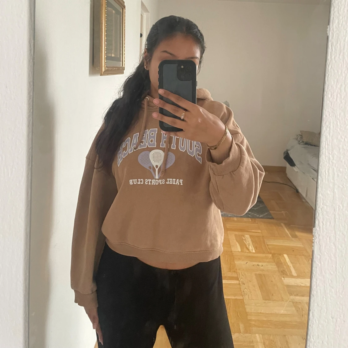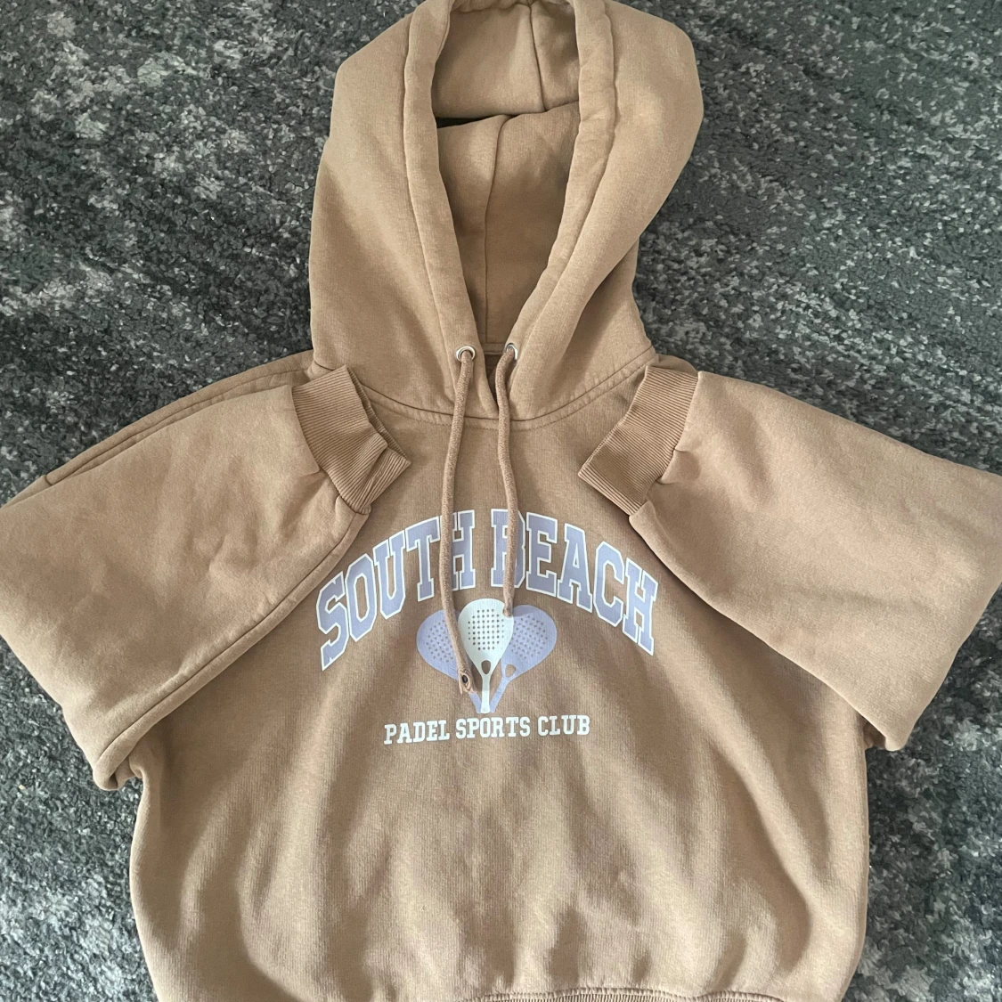 Säljer en beige hoodie från 157 med trycket 'South Beach Padel Sports Club' i vitt och ljusblått. Tröjan har huva med snörning, ribbade muddar och en loose passform. Perfekt för chill dagar och sportiga vibes.En liten vit fäck där bak, synd knappt (se på bild) .