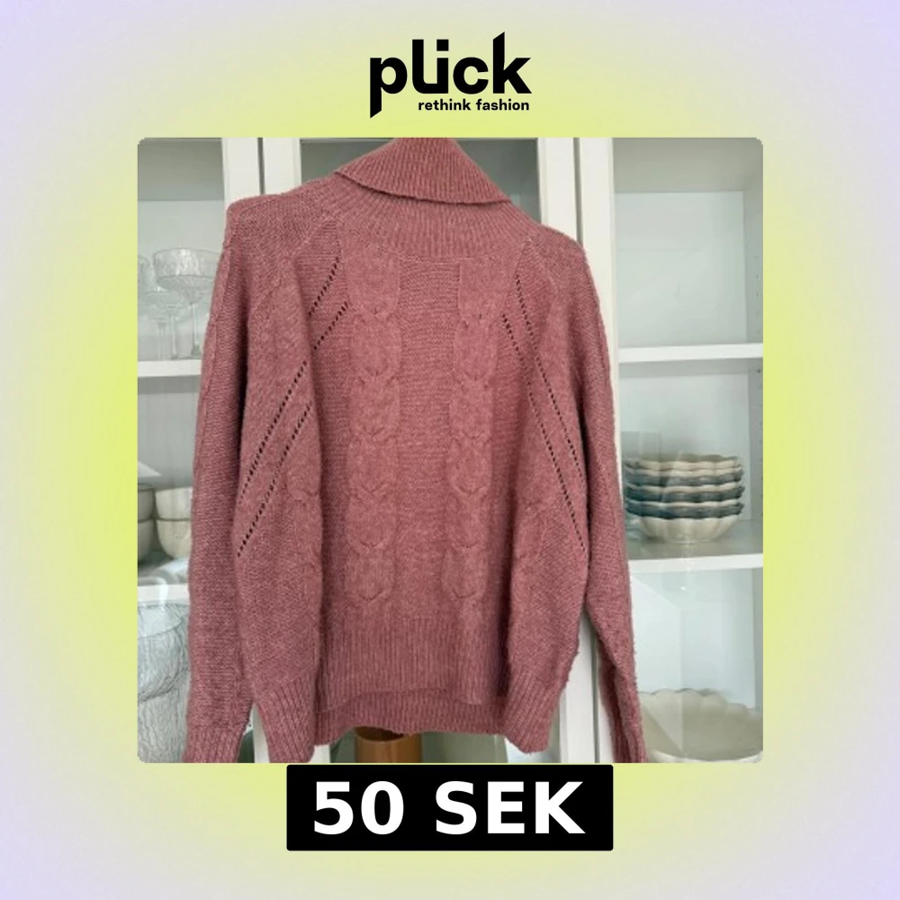 Mysig rosa stickad polotröja med kabelstickat mönster och långa ärmar. Bra skick.