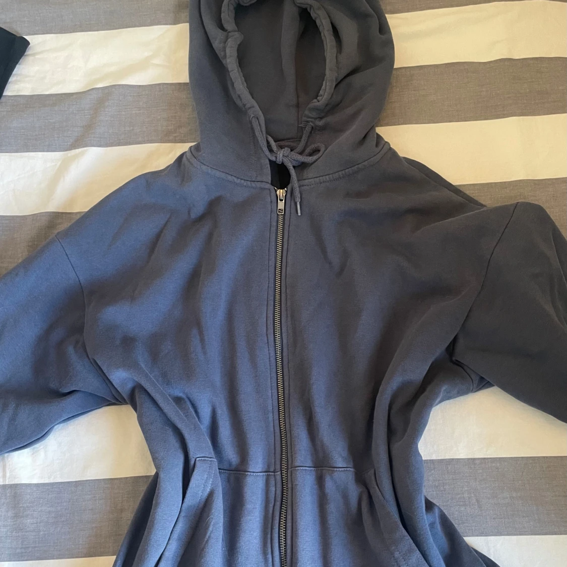 Säljer en mörkblå hoodie med hel dragkedja och huva med snörning. Tröjan har en avslappnad passform och är tillverkad i mjukt bomullsmaterial. Perfekt för kyliga dagar när du vill vara både bekväm och snygg.