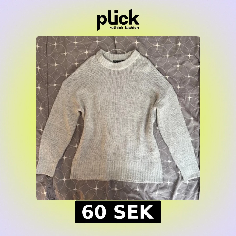 Säljer en stilren grå stickad tröja med rund hals och långa ärmar. Tröjan har en ribbad struktur vid ärmslut och nederkant. Strlk M, passar XS-M