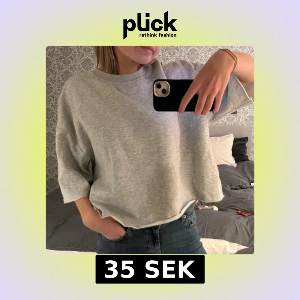 Säljer en stilren grå croppad tröja med korta ärmar. Perfekt för en avslappnad look. Passar bra till jeans eller kjol.