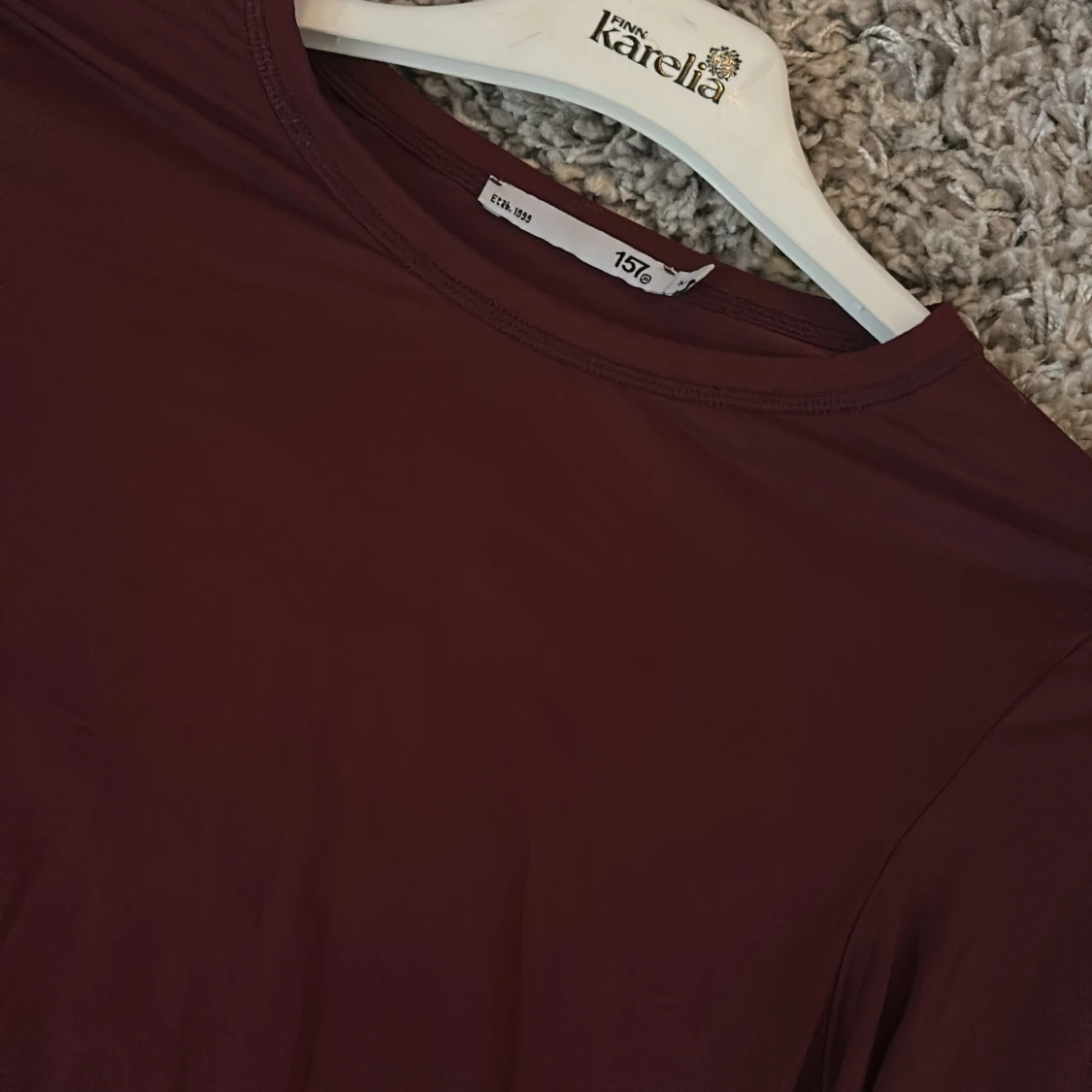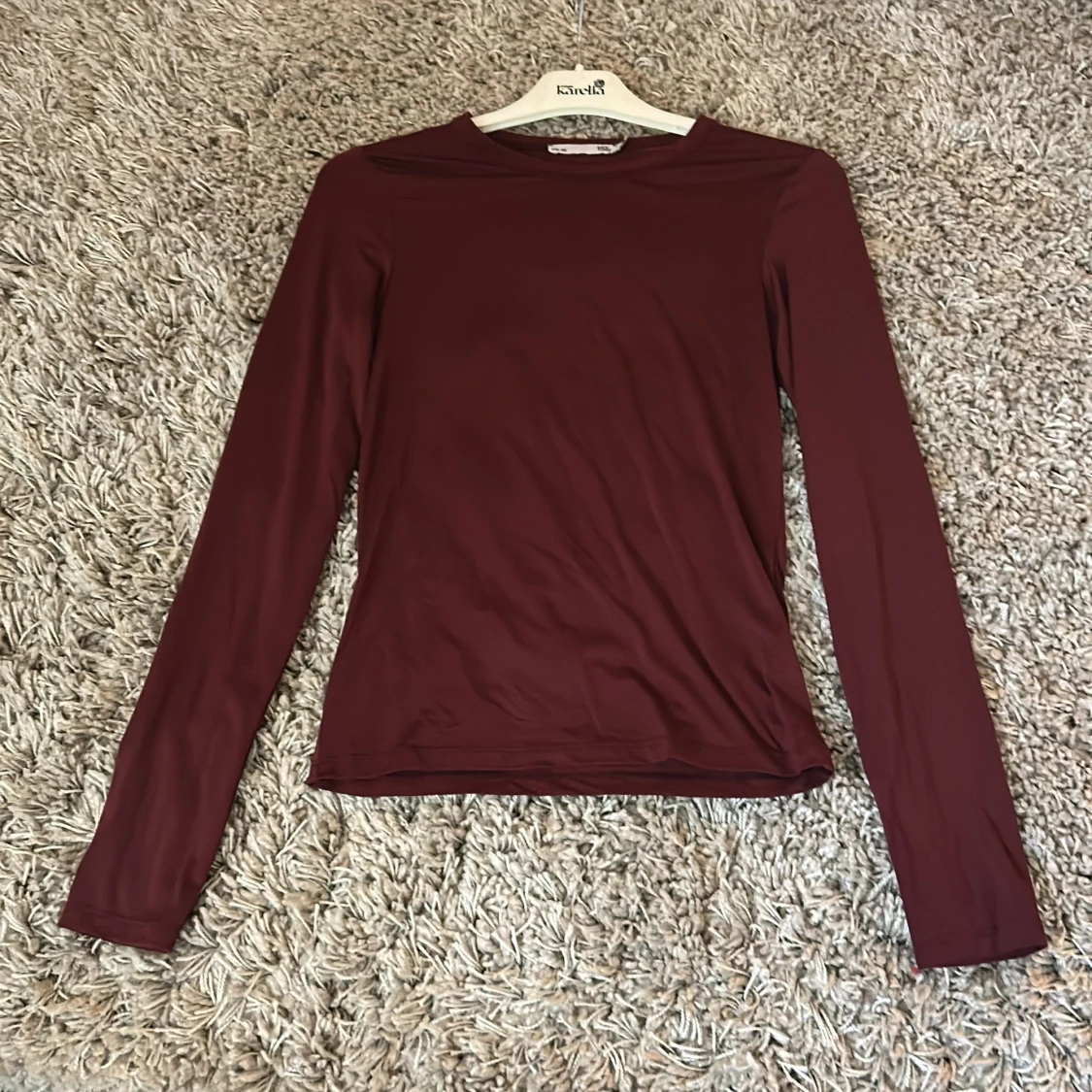 En basic mörkröd långärmad tröja från 157 med rund halsringning. Tröjan är figurnära och tillverkad i ett mjukt, stretchigt syntetmaterial som känns skönt mot huden. Perfekt att styla med jeans eller kjol för en clean look.