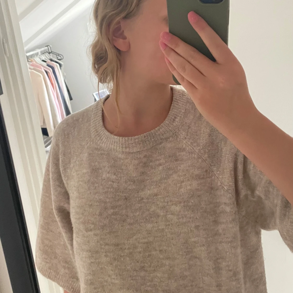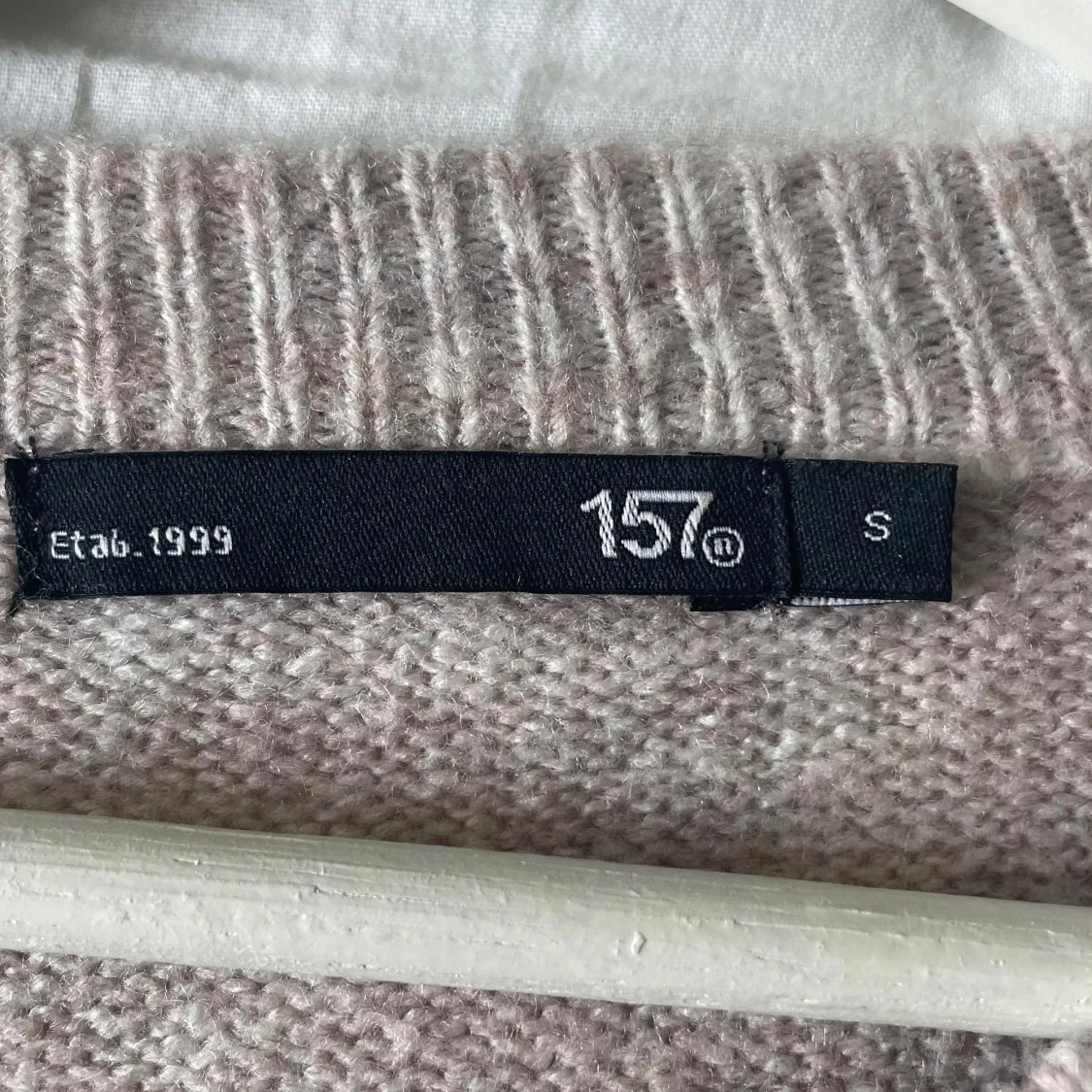 Mysig beige stickad tröja från 157 med rund halsringning och avslappnad passform. Tröjan har halvlånga ärmar och ribbade muddar vid hals och nederkant. Perfekt för lager-på-lager under höst och vinter.