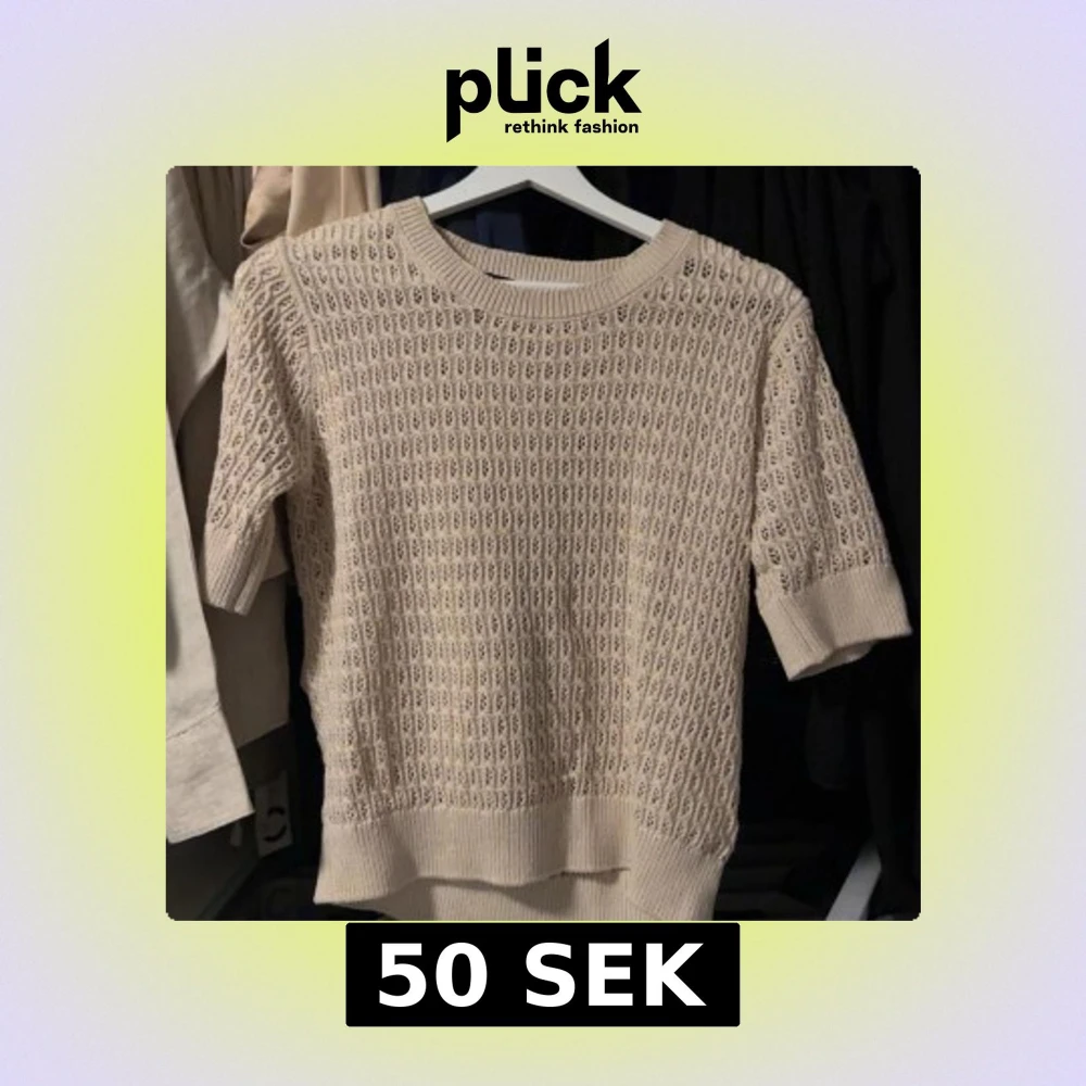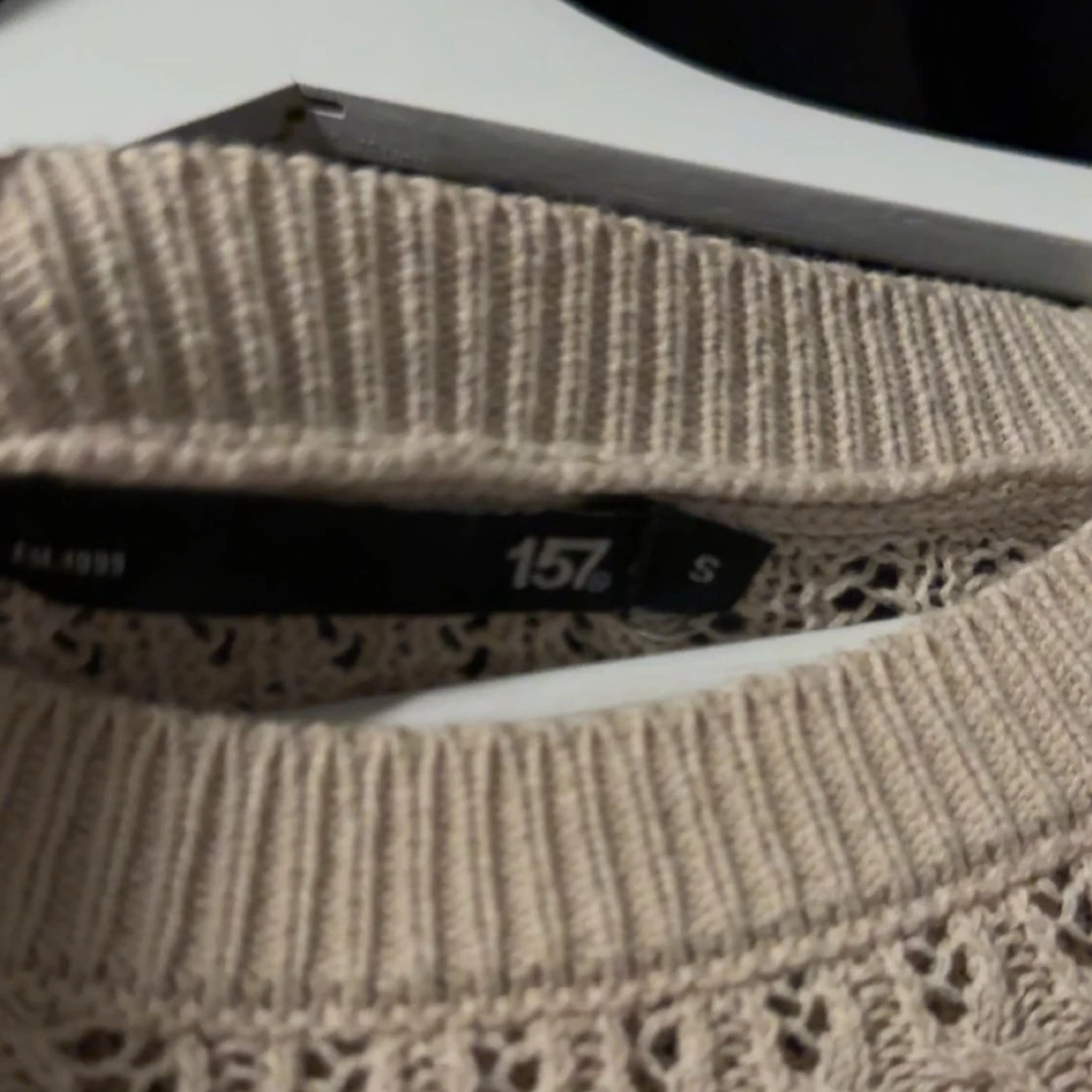 Säljer en beige stickad tröja från 157 med korta ärmar och snyggt hålmönster. Tröjan har rund hals och breda ribbade muddar vid ärmslut och nederkant. Perfekt för dig som gillar en chill och stilren look.