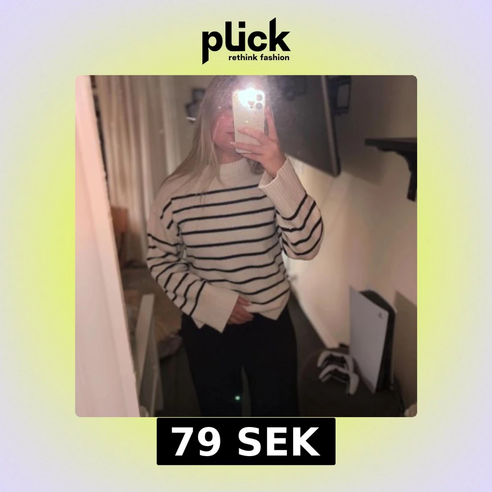 Säljer en snygg vit stickad tröja med svarta ränder. Tröjan har en rund hals och långa ärmar med ribbade muddar💗