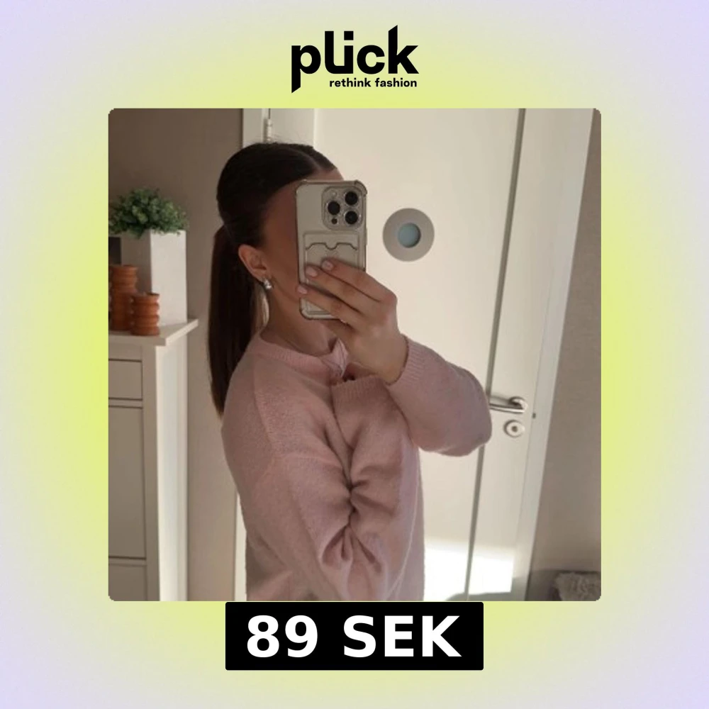 Mysig rosa stickad tröja med rund halsringning och långa ärmar.