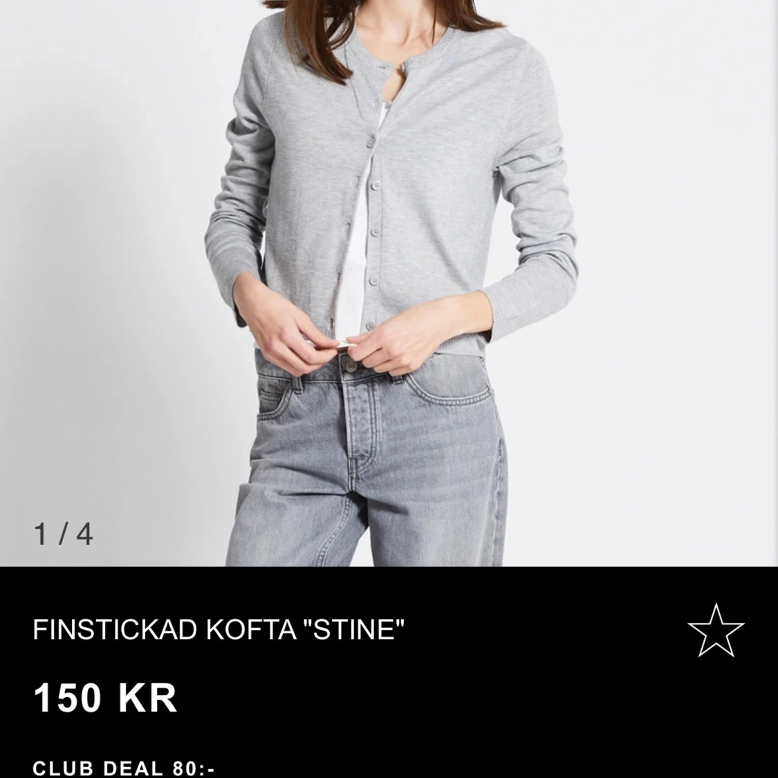 Säljer en ljusgrå finstickad kofta från Stine. Koftan har rund halsringning, knappar framtill och långa ärmar. Perfekt att slänga över en t-shirt för en clean och enkel look. Materialet är mjukt och tunt, vilket gör den skön att bära.