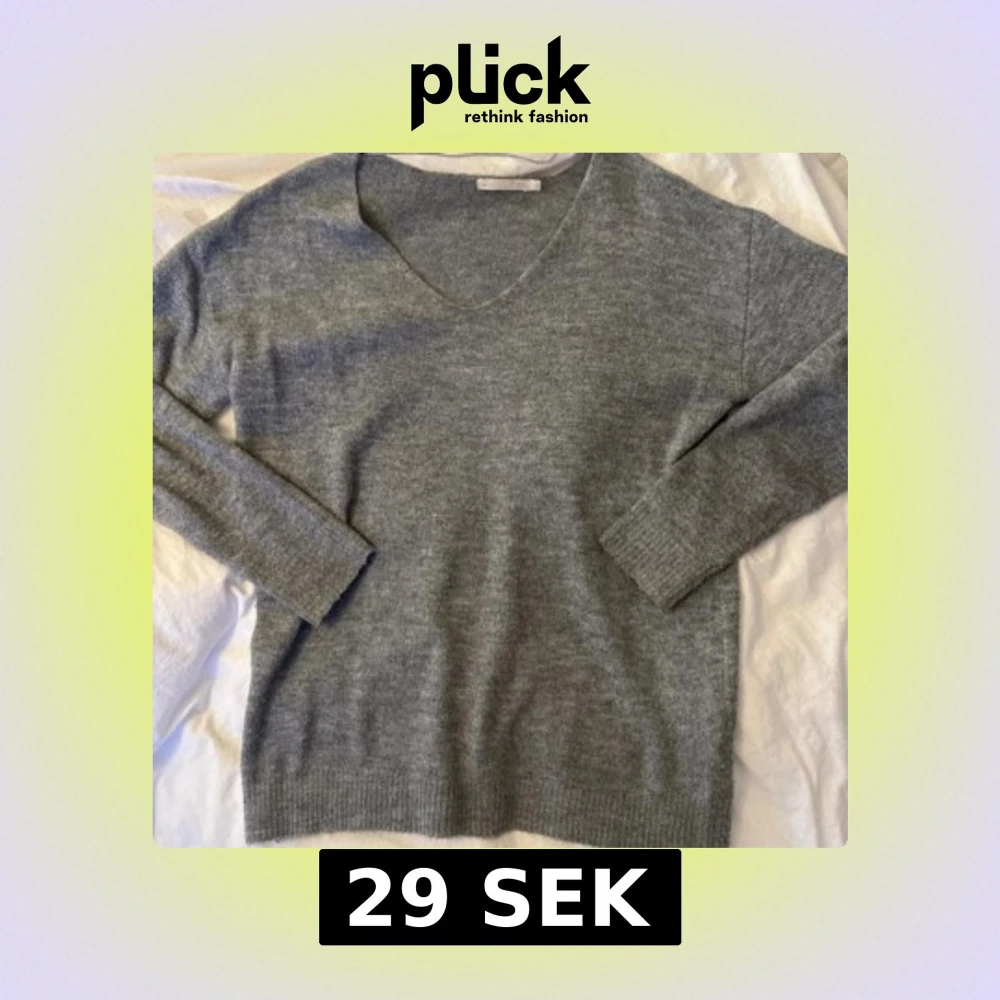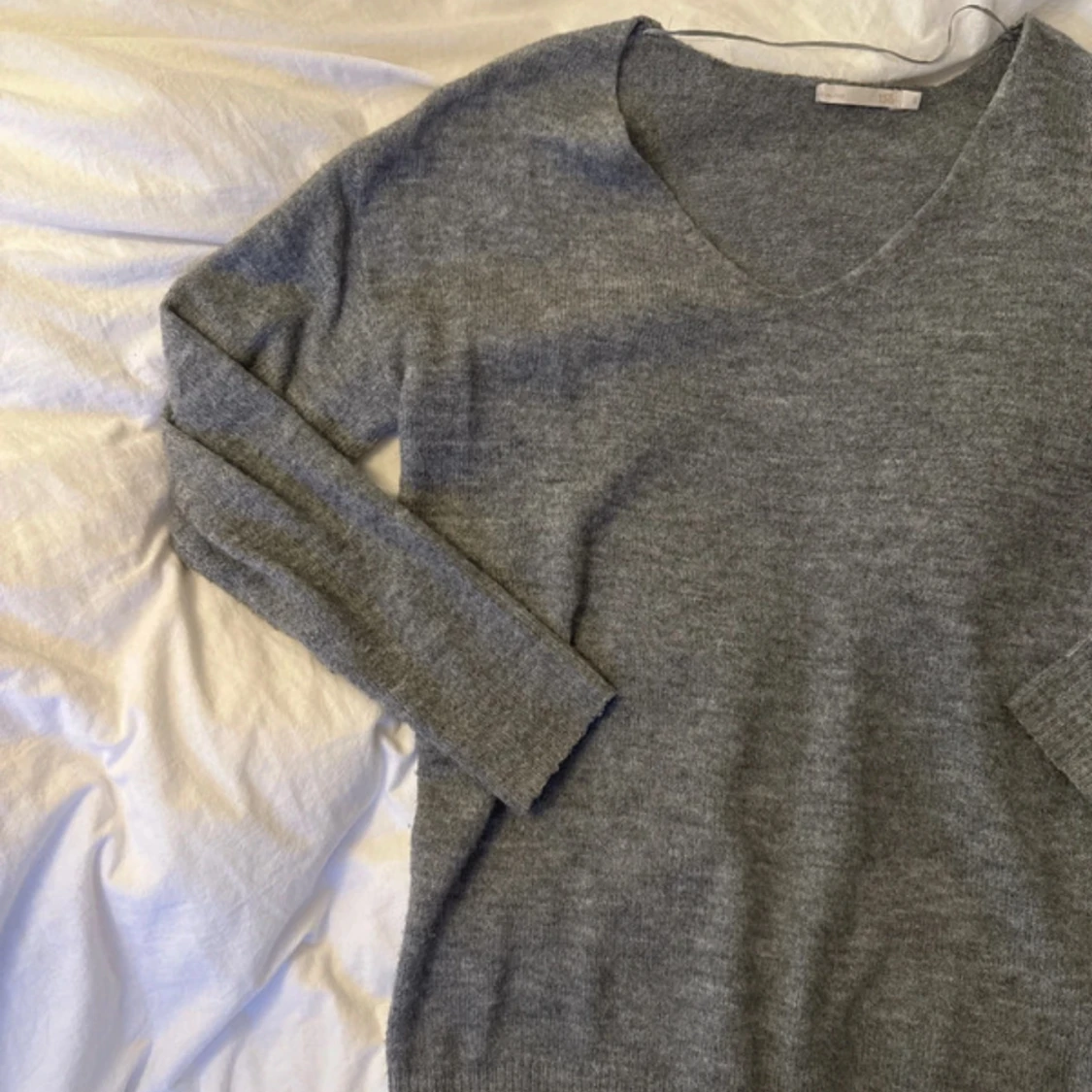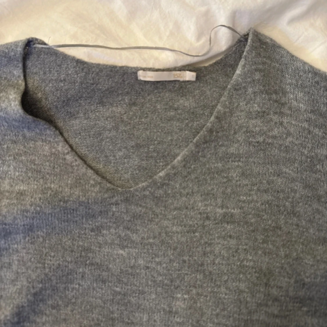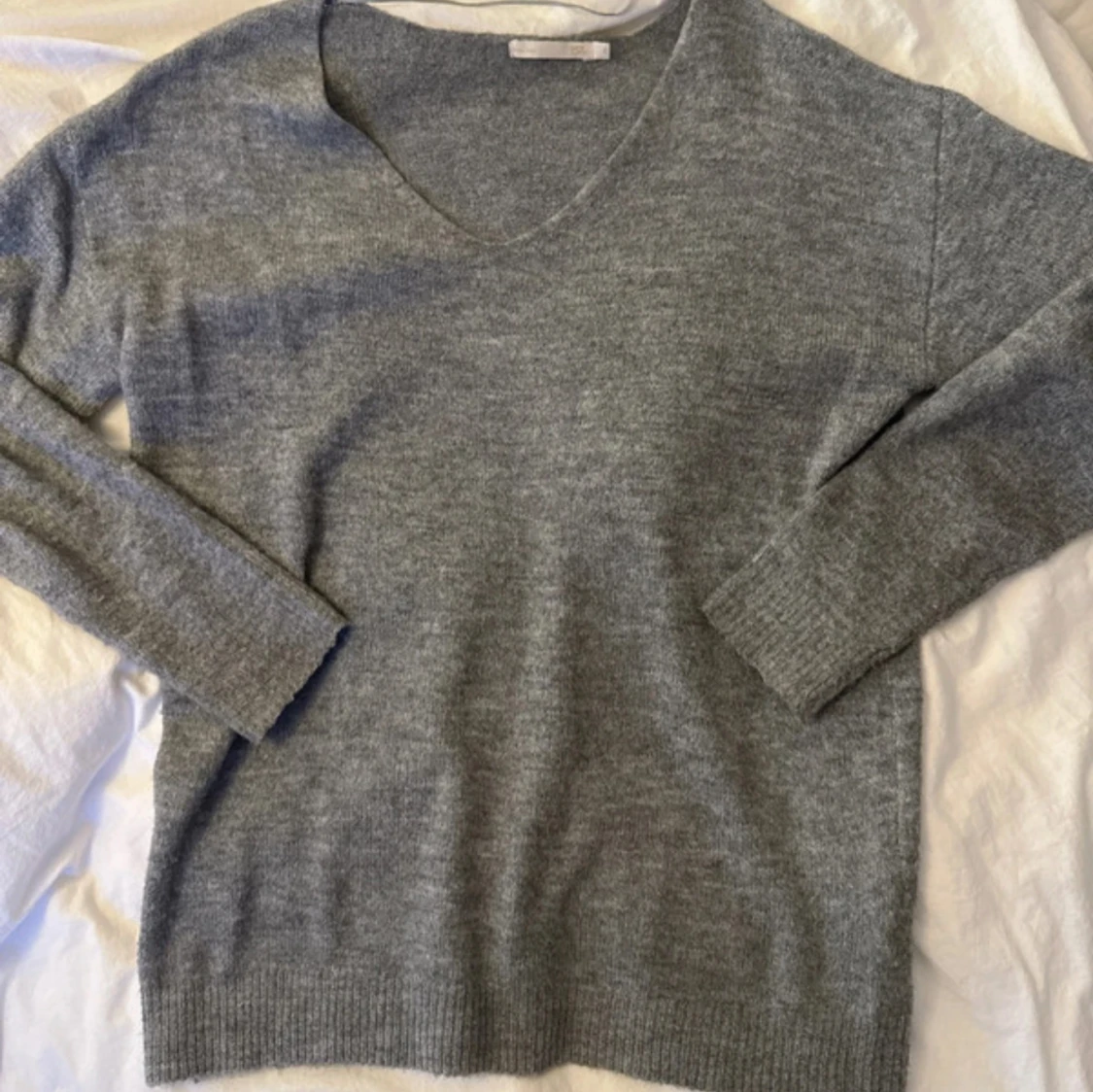 Mjuk och stilren grå stickad tröja i storlek S. Tröjan har en snygg v-ringning och långa ärmar med ribbade muddar. Perfekt för dig som gillar enkel och clean look med lite oversized känsla.