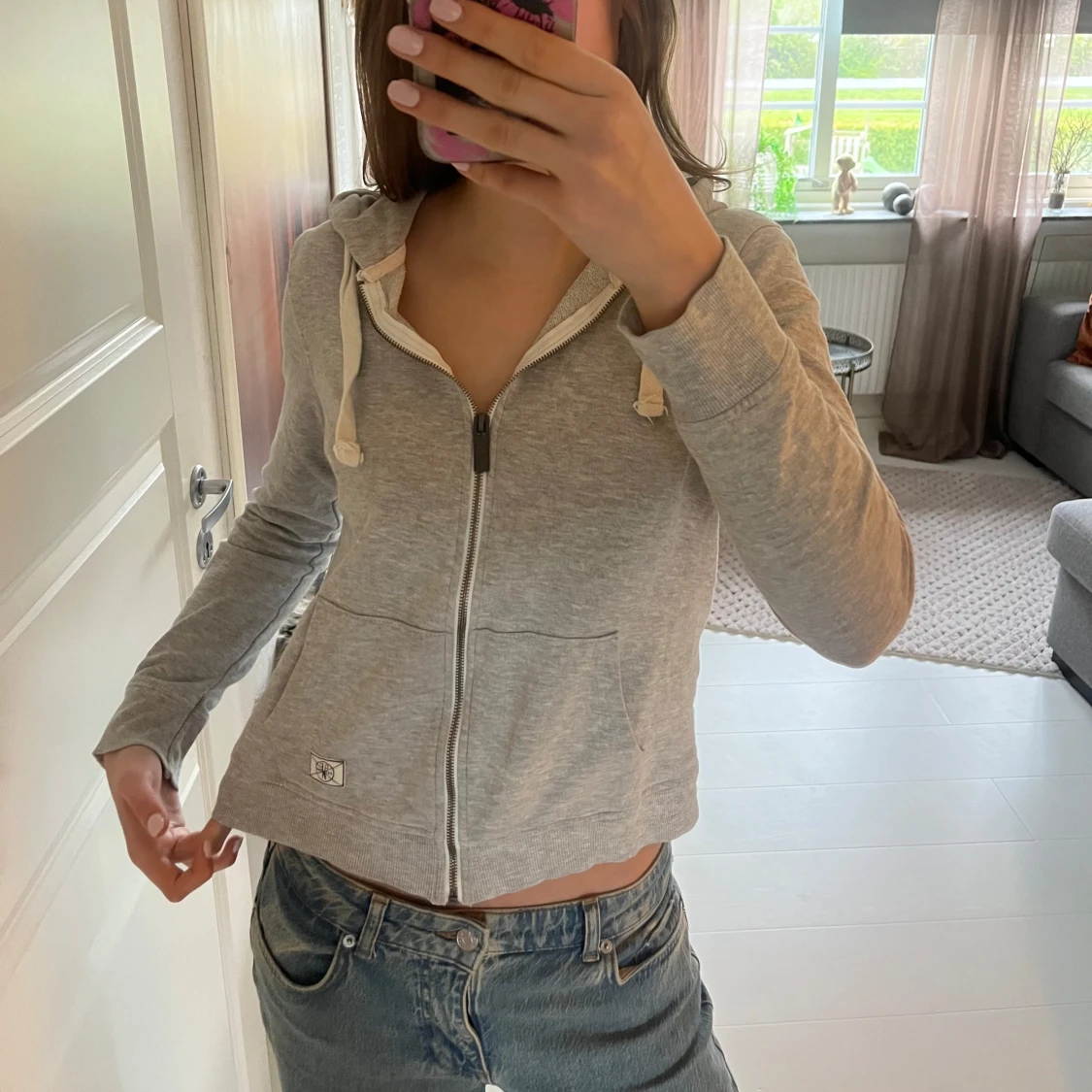 Säljer en ljusgrå hoodie med dragkedja och huva. I bra skick, inga synliga defekter