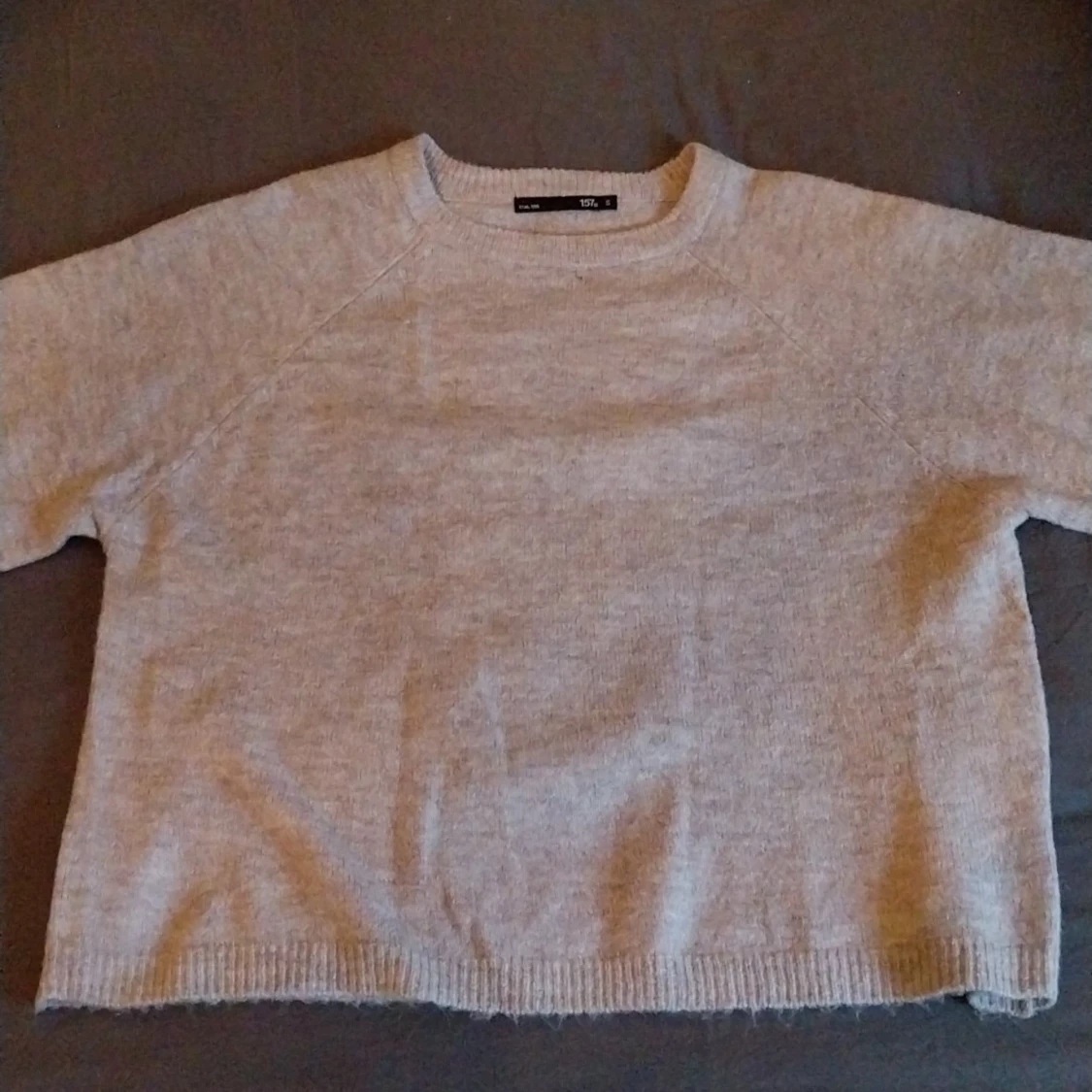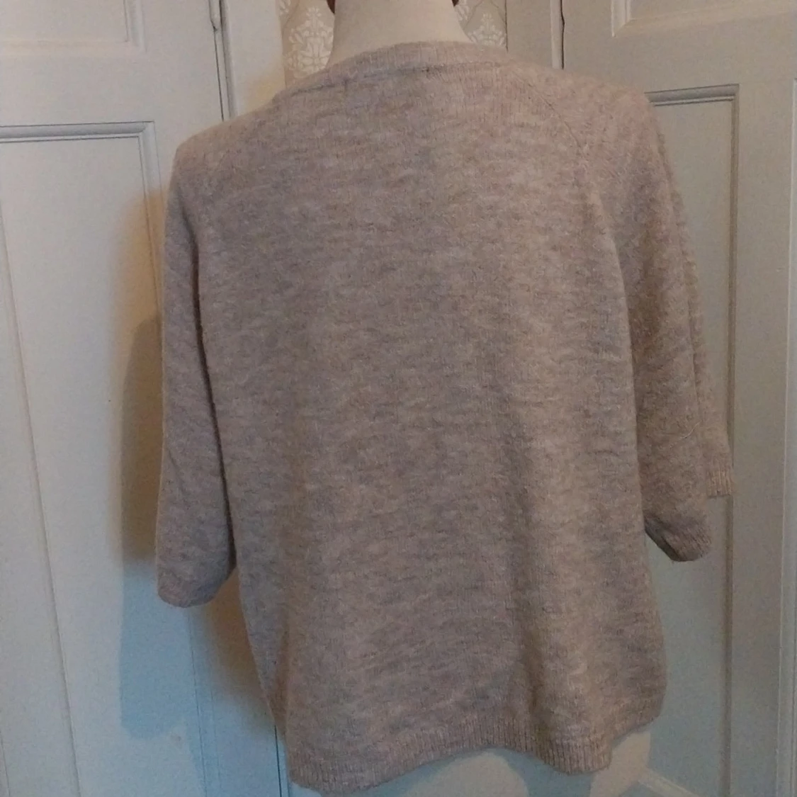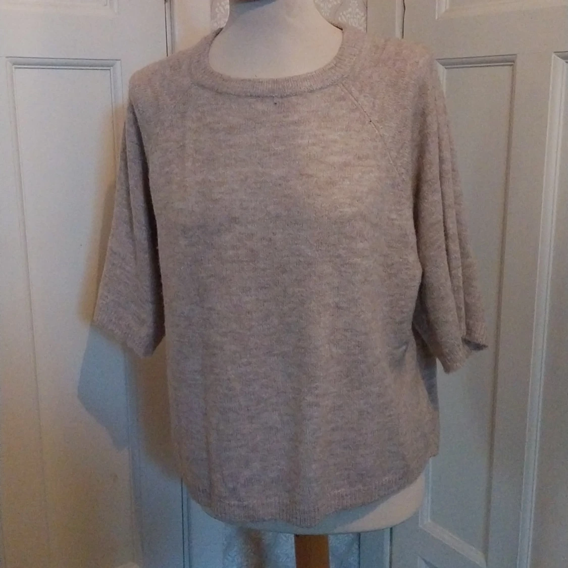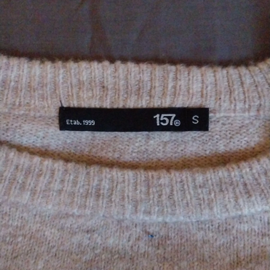 Mysig beige stickad tröja från 157 med rund halsringning och trekvartsärm. Tröjan har en avslappnad passform och ribbade muddar vid ärmslut och nederkant. Perfekt för lager på lager under kyliga dagar.