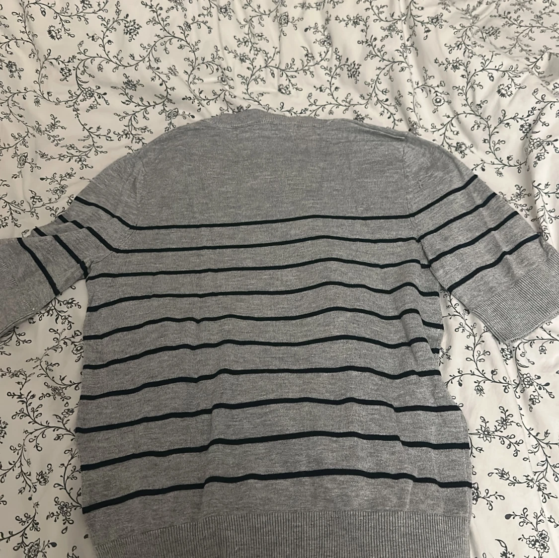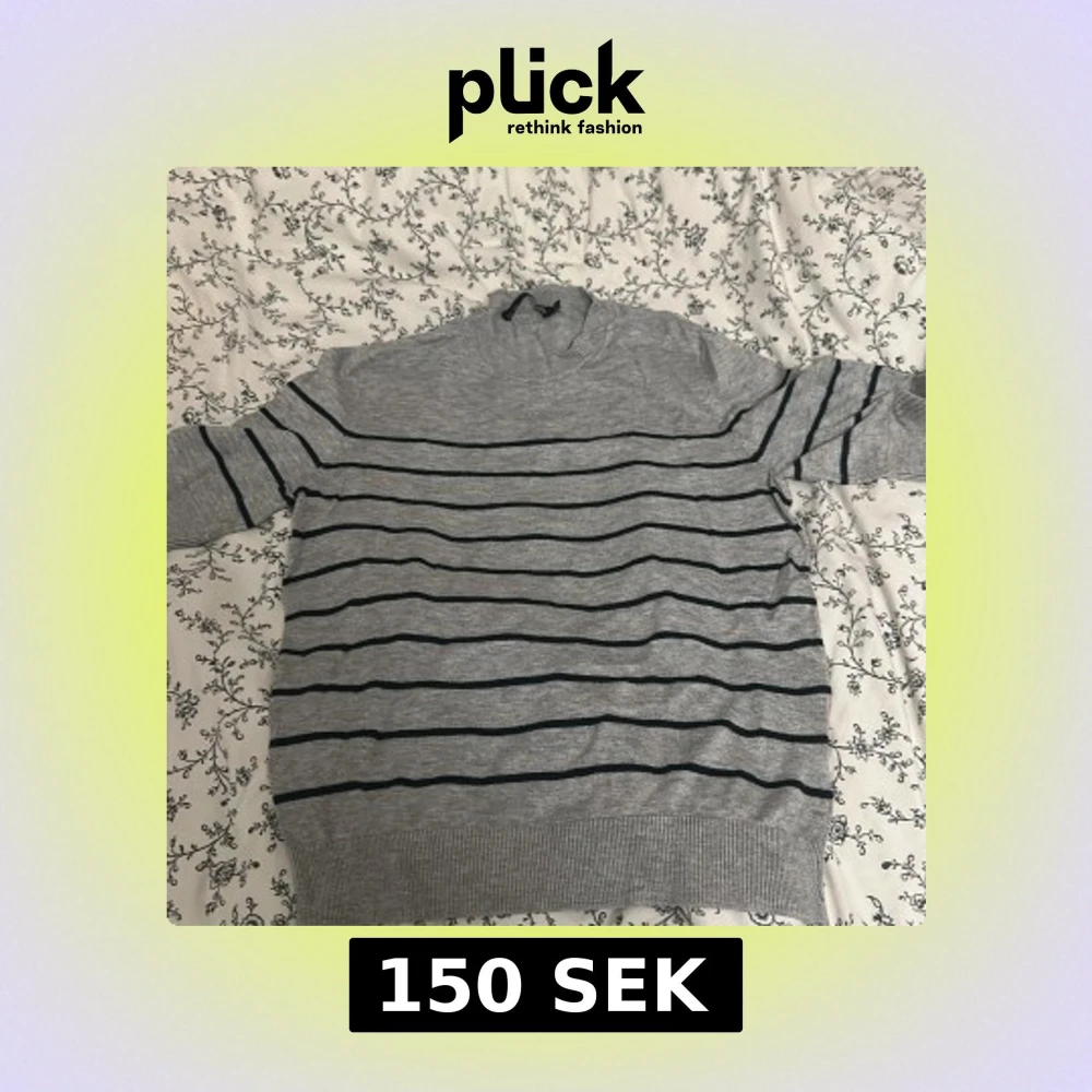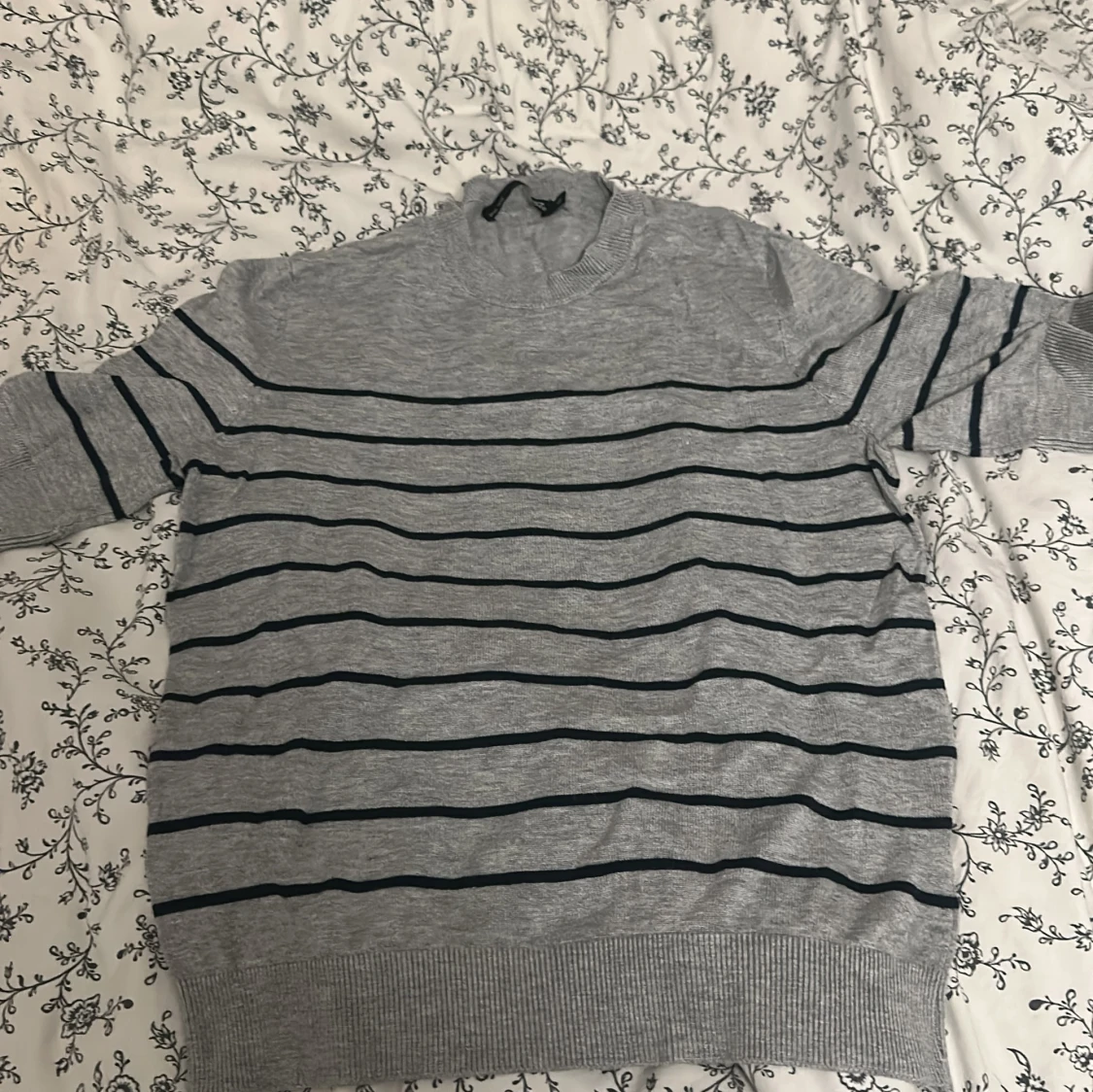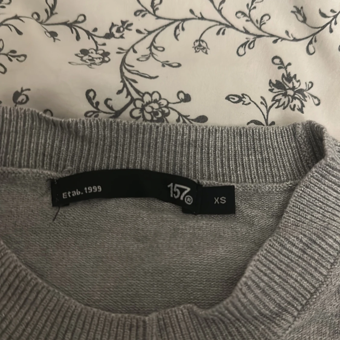 Grå tröja från 157 i storlek XS med svarta horisontella ränder. Tröjan har ribbade muddar vid hals, ärmslut och nederkant. Klassisk och enkel design som funkar året runt. Materialet känns mjukt och lätt, perfekt för lager-på-lager.