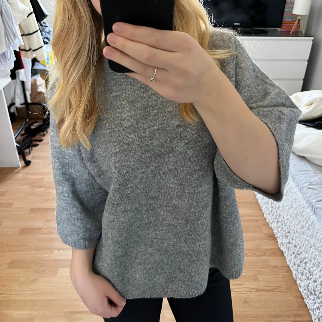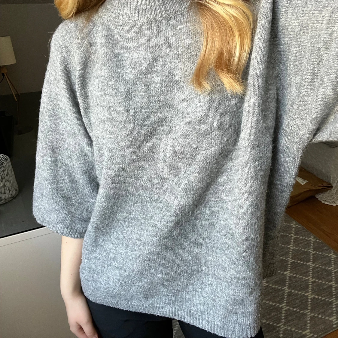 Mysig grå stickad tröja med trekvartsärmar och högre ribbad hals. Tröjan har en loose passform och är perfekt för lager-på-lager. Enkel och stilren design som funkar till allt. Superbekväm och köpt från Lager 157 🫶🏻