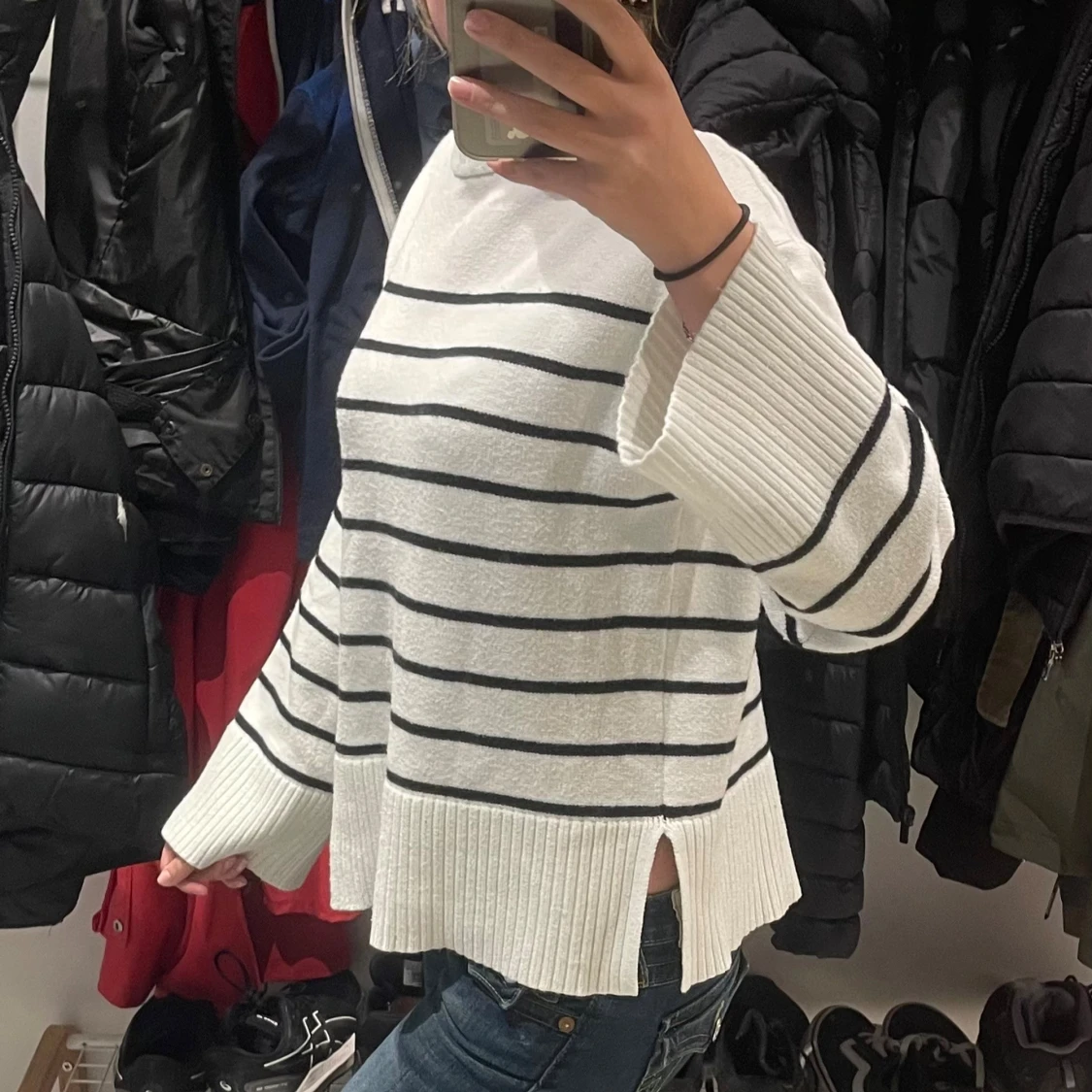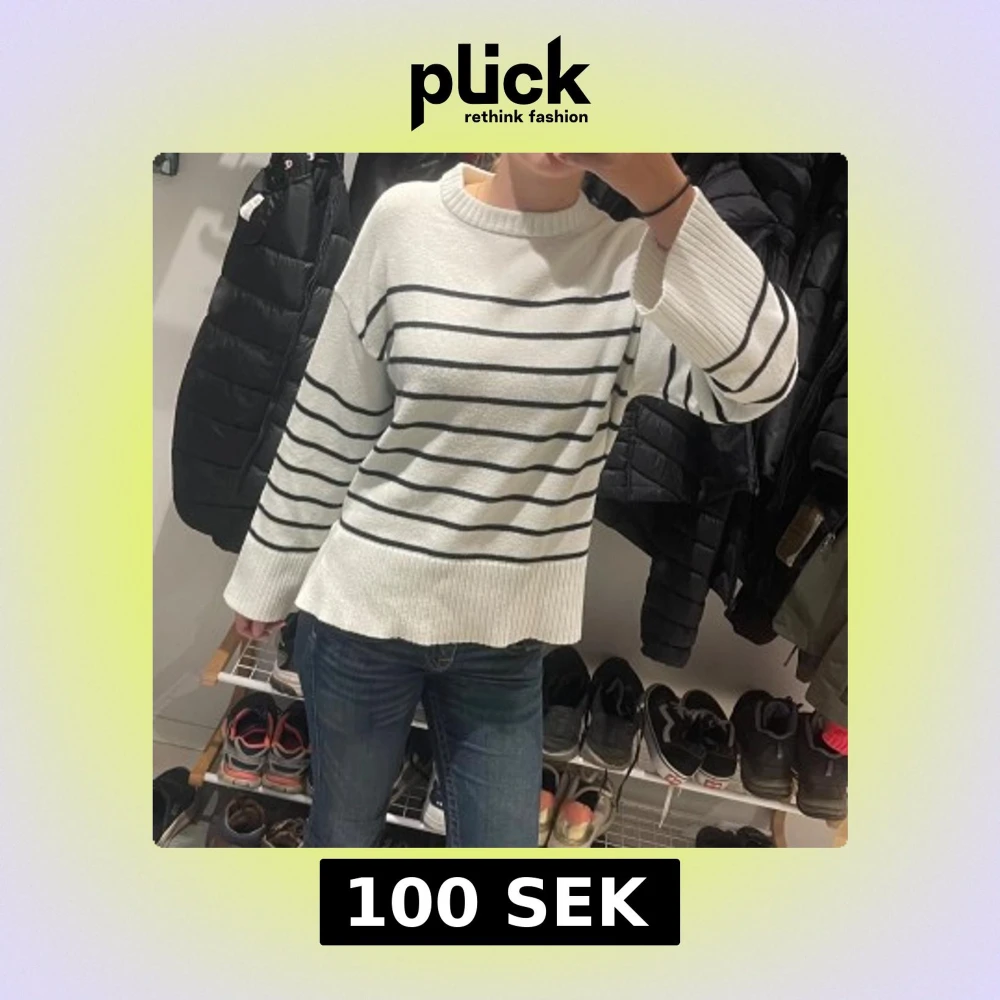 Säljer en vit stickad tröja med svarta horisontella ränder och breda ribbade muddar vid ärmslut och nederkant. Storleken är xs-s Tröjan har rund hals och slits på sidorna. Perfekt att matcha med jeans eller till hösten💕