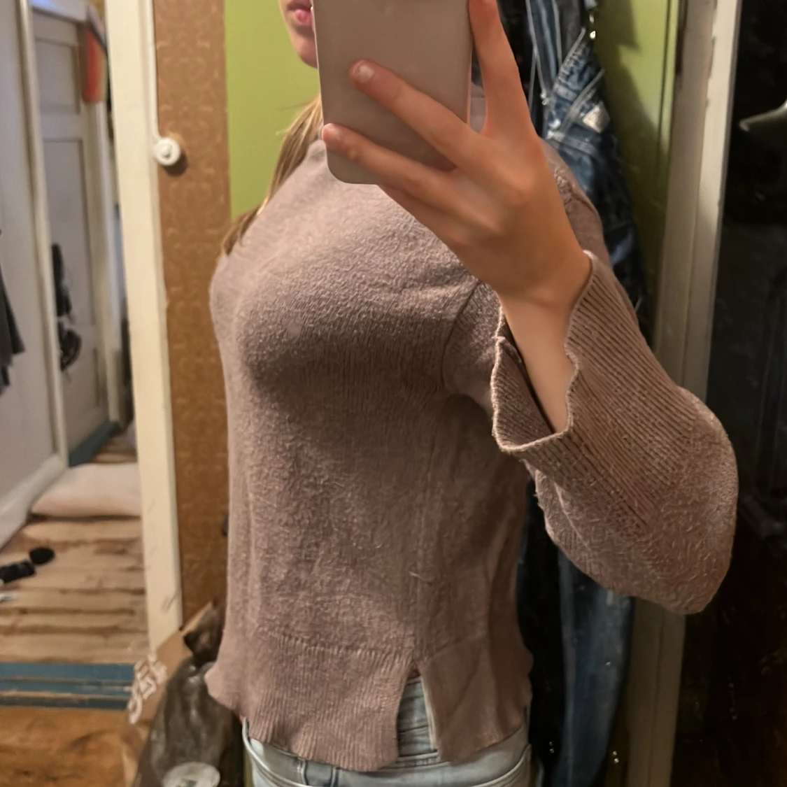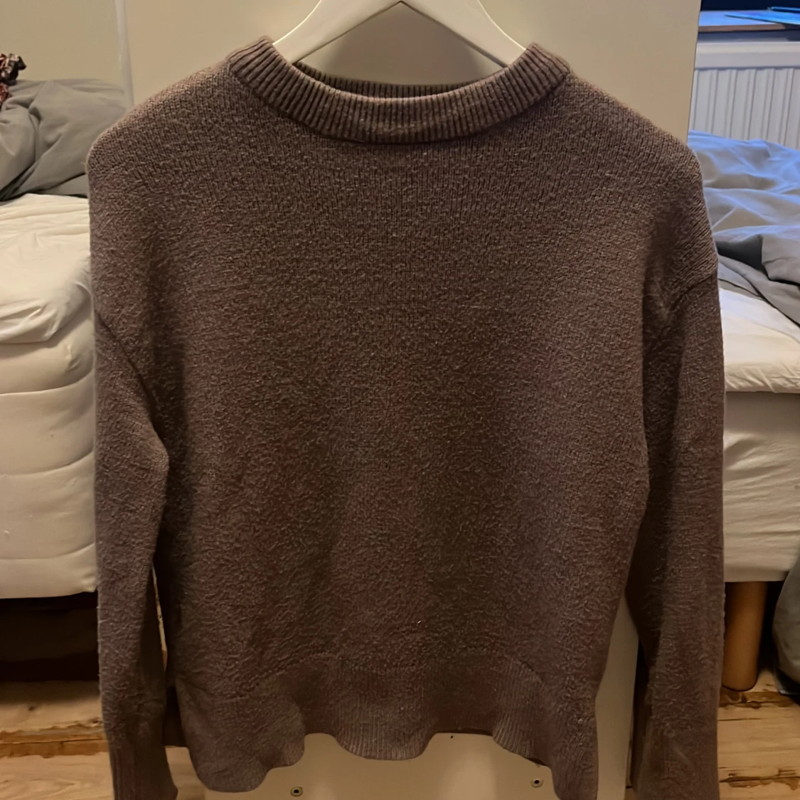 Mysig beige stickad tröja med rund halsringning och långa ärmar. Tröjan har ribbade muddar och en liten slits på sidorna nedtill, vilket ger en snygg detalj. Perfekt att matcha med jeans för en chill look.
