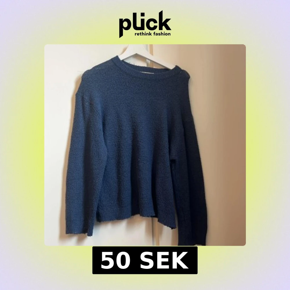 Mysig mörkblå stickad tröja med rund halsringning och långa ärmar.