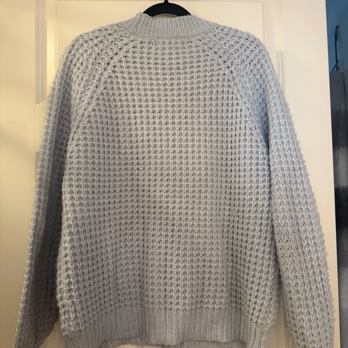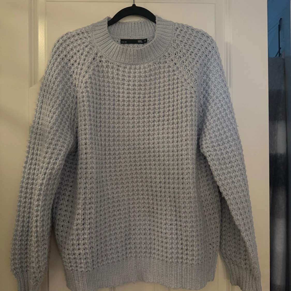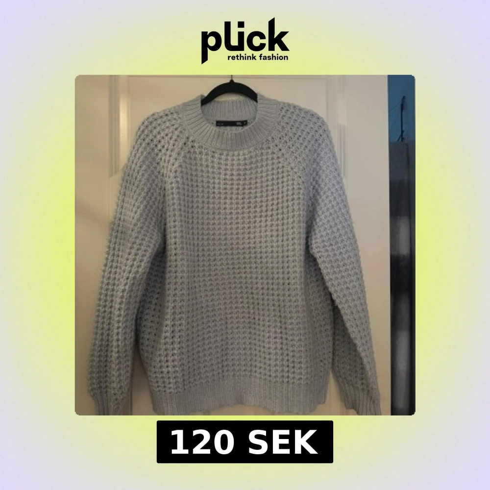 Supermysig ljusgrå stickad tröja med grovstickat mönster och rund hals. Tröjan har långa ärmar och breda ribbade muddar vid ärmslut och nederkant. Perfekt för kyliga dagar och enkel att styla till jeans eller kjol.