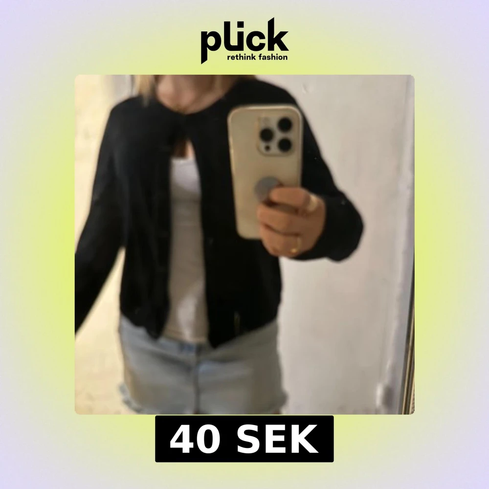 En svart cardigan jacka med rund hals och knäppning framtill. Jackan är långärmad och har ribbade muddar vid ärmslut och nederkant. Perfekt att slänga över ett linne eller t-shirt för en chill look. Väldigt liten i storleken och passar mig med xs.