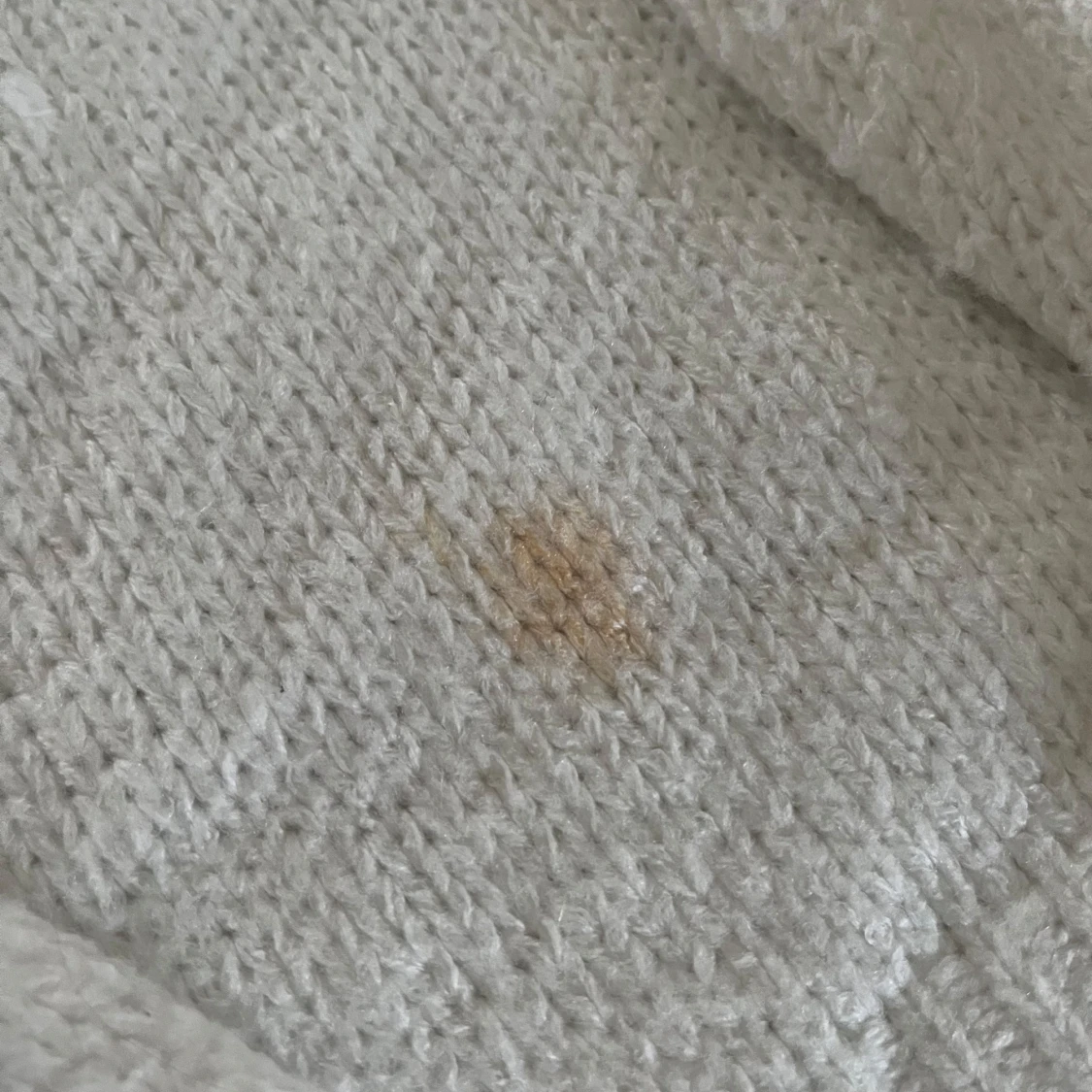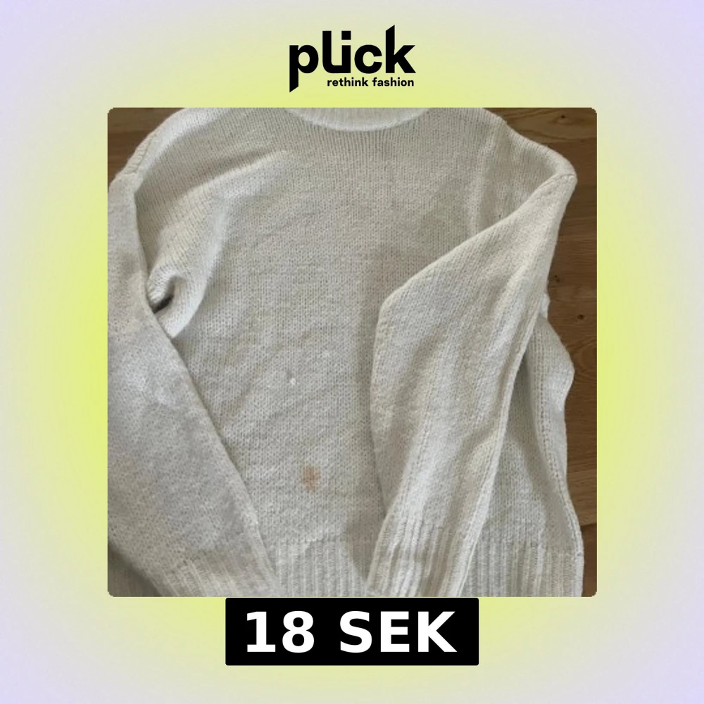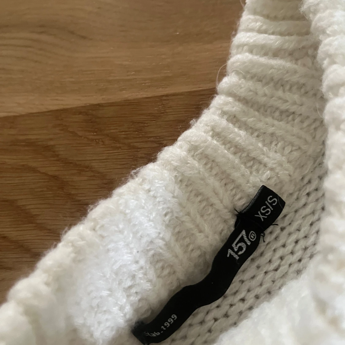 Mysig vit stickad tröja från 157 med ribbad krage och långa ärmar. Enkel och klassisk design som passar perfekt till lager-på-lager. Tröjan är i en ljus nyans och har en skön, lite loose passform. Har några fläckar som man ser på bilderna, kanske går bort om man försöker