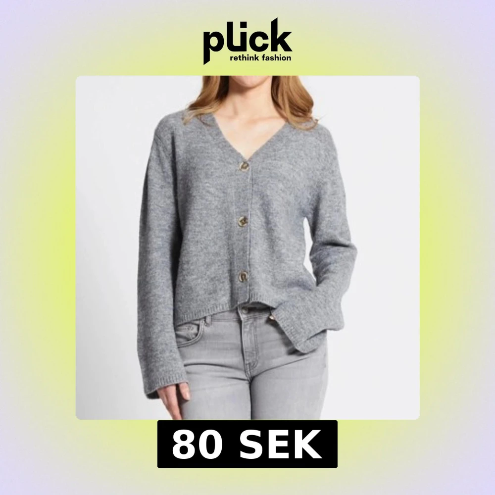 Säljer en stilren grå kofta med knappar framtill. Den har en v-ringad design och långa ärmar. knappt använd, mycket bra skick!