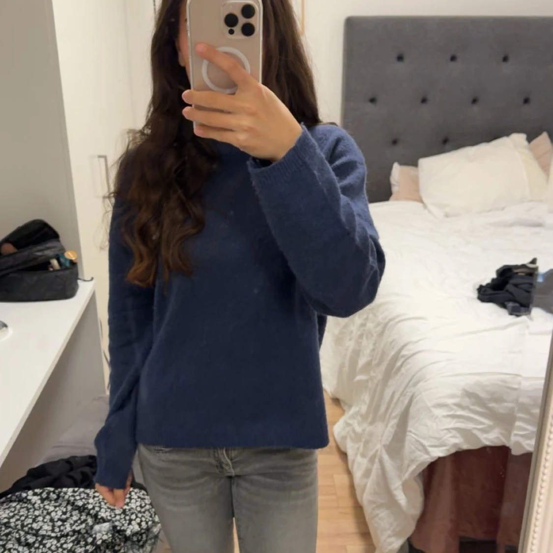 Säljer en enkel och snygg mörkblå stickad tröja med rund hals och långa ärmar. Perfekt att matcha med jeans eller kjol. Tröjan har en normal passform och är mjuk och skön mot huden.