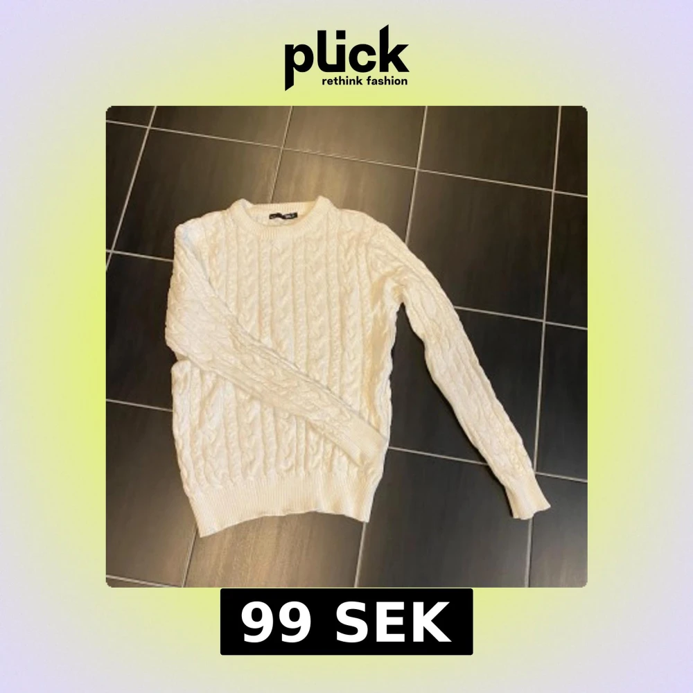 Säljer en klassisk vit kabelstickad tröja från lager 157. Tröjan har rund halsringning, långa ärmar och ribbade muddar vid ärmslut och nederkant. Perfekt för lager-på-lager och enkel att matcha med olika outfits. I fint skick!