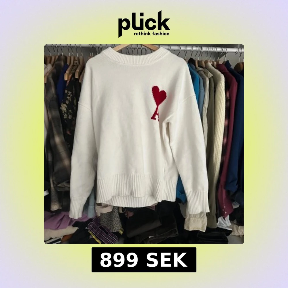 Säljer en stilren vit stickad tröja från Ami Paris med ett rött hjärtmönster på bröstet. Tröjan har långa ärmar och ribbade kanter vid ärmslut och nederkant. Perfekt för en trendig och bekväm look.