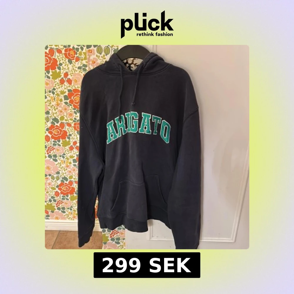 Säljer en svart hoodie med grön text från Arigato. Inga defekter bra skick storlek S sitter som S. Nypris 2 tusen mitt pris 299kr
