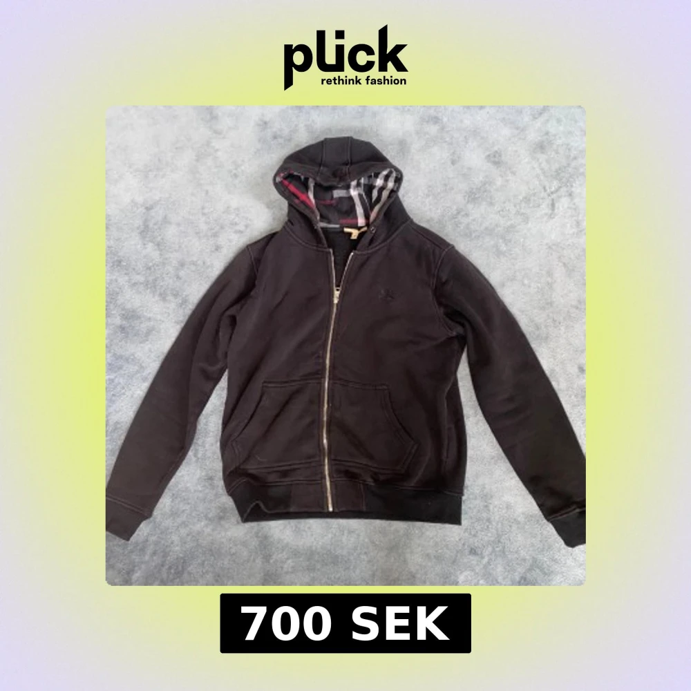 Svart hoodie från Burberry i bomull med klassiskt rutigt foder i huvan. Tröjan har dragkedja framtill, två fickor och broderad logga på bröstet. Perfekt för dig som gillar stilrena och exklusiva plagg. Storlek M.