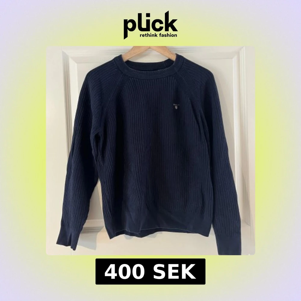 Säljer en stilren mörkblå ribbad tröja från GANT. Tröjan har en klassisk design med rund hals och långa ärmar. Kontakta ifall frågor