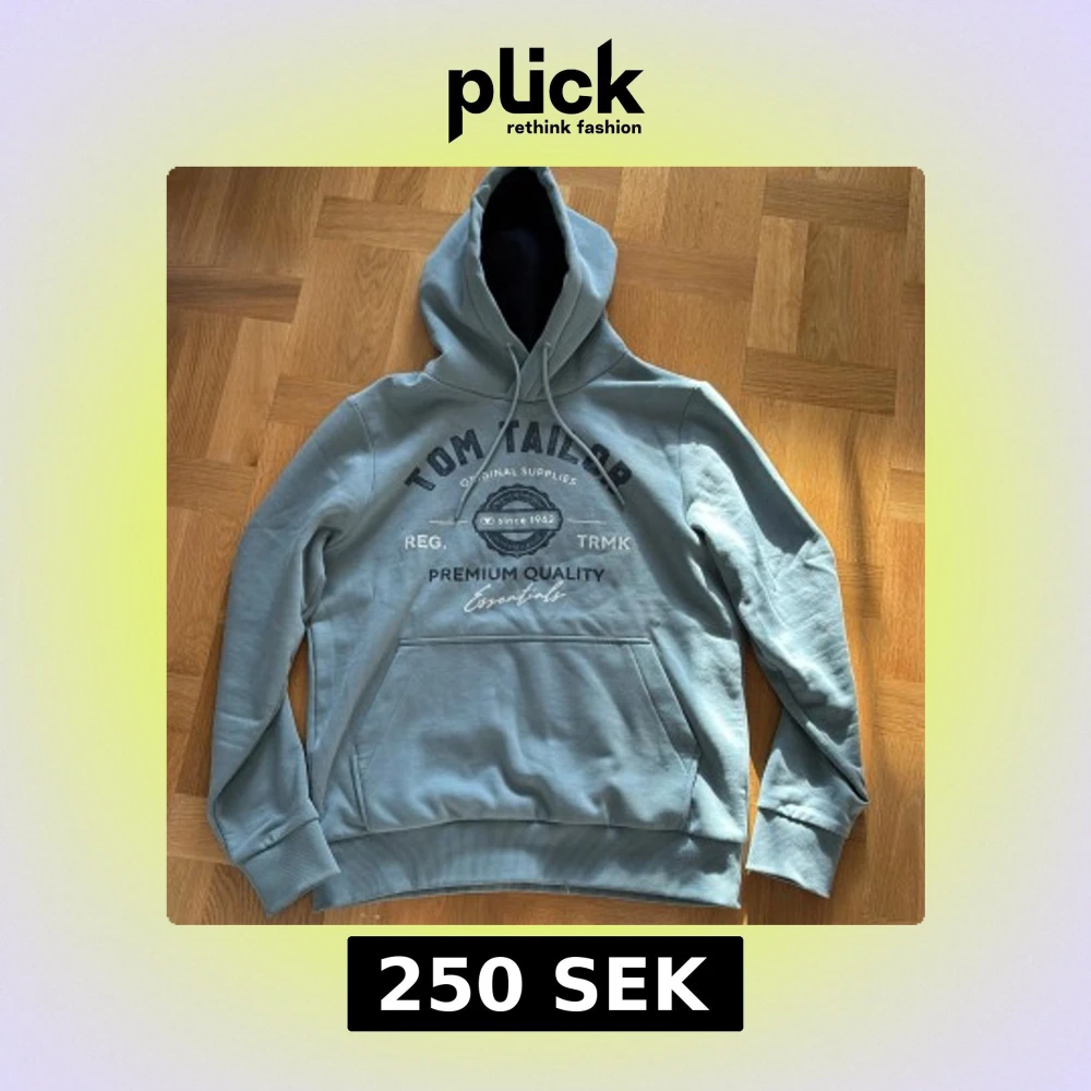 Säljer en stilren grå hoodie från Tom Tailor med tryck på framsidan. Den har en klassisk känguruficka och justerbar huva med dragsko. Perfekt för en avslappnad look.