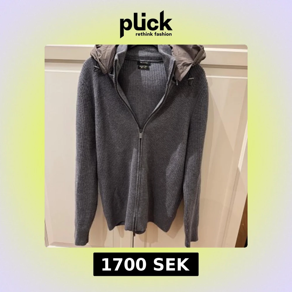 Snygg grå stickad cardigan från Massimo Dutti med dragkedja och avtagbar huva. Perfekt för kyliga dagar med sin ribbade design och långa ärmar. En stilren och praktisk tröja för alla tillfällen.