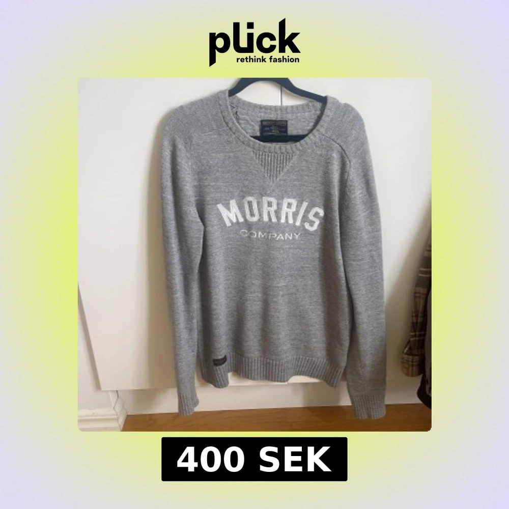 Säljer en grå stickad tröja från Morris Company med vit broderad logga framtill. Tröjan har rund halsringning och långa ärmar med ribbade muddar vid ärmslut och nederkant. Perfekt för lager-på-lager under kyliga dagar.