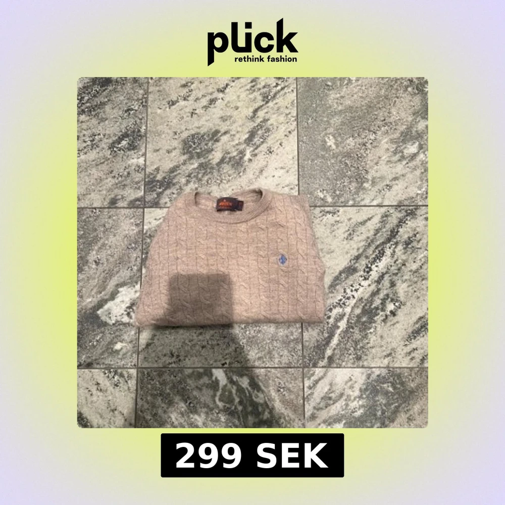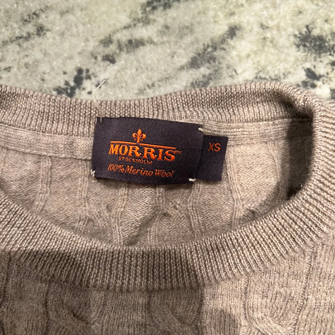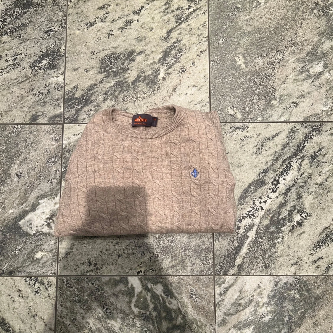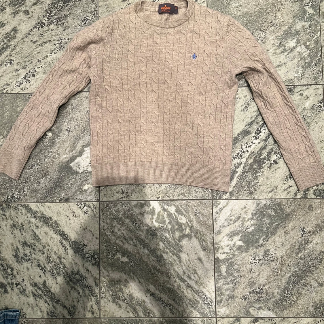 Snygg beige kabelstickad tröja från Morris i 100% merinoull. Rund hals, långärmad och med ett litet blått broderat emblem på bröstet. Perfekt för dig som gillar klassisk stil med en modern touch. Supermjuk och skön att ha på sig.
