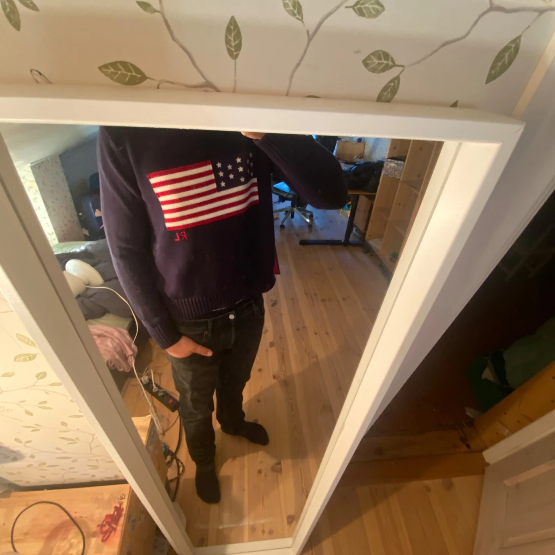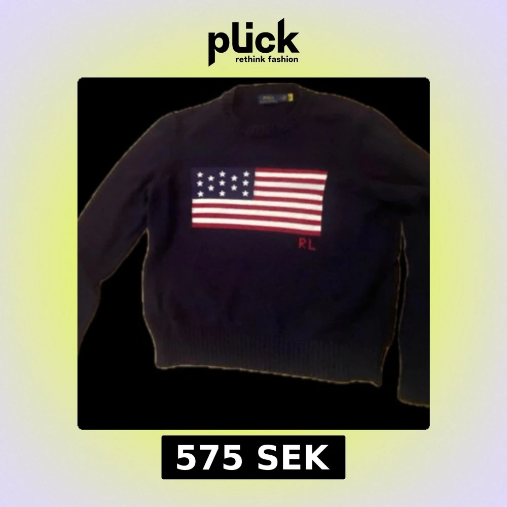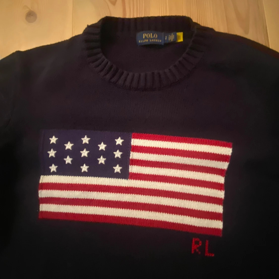 Mörkblå stickad tröja från Polo Ralph Lauren med amerikansk flagga broderad på bröstet och RL-detalj i rött. Den passar 160-176Klassisk rund halsringning och ribbade muddar. Perfekt för dig som vill sticka ut med en ikonisk look.